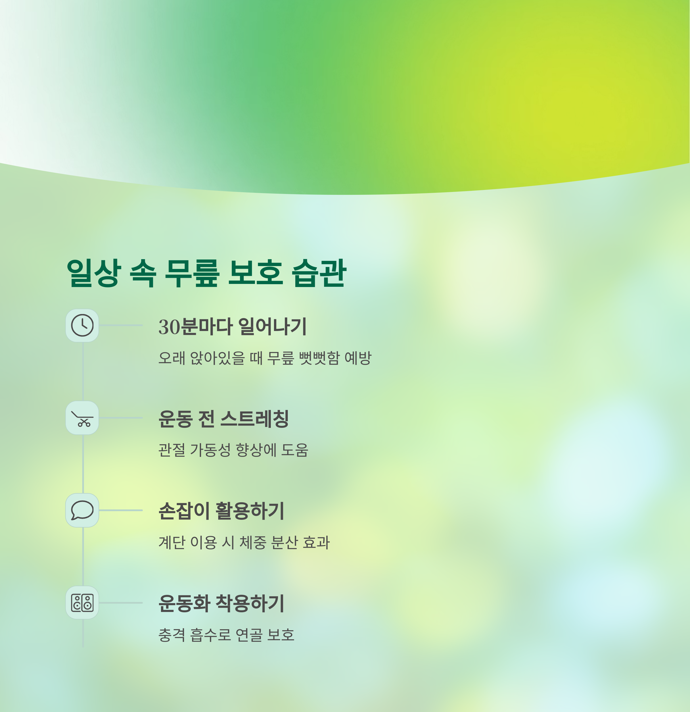 | 오래 앉아 있을 때 | 30분마다 일어나기 | 무릎 뻣뻣함 예방 |