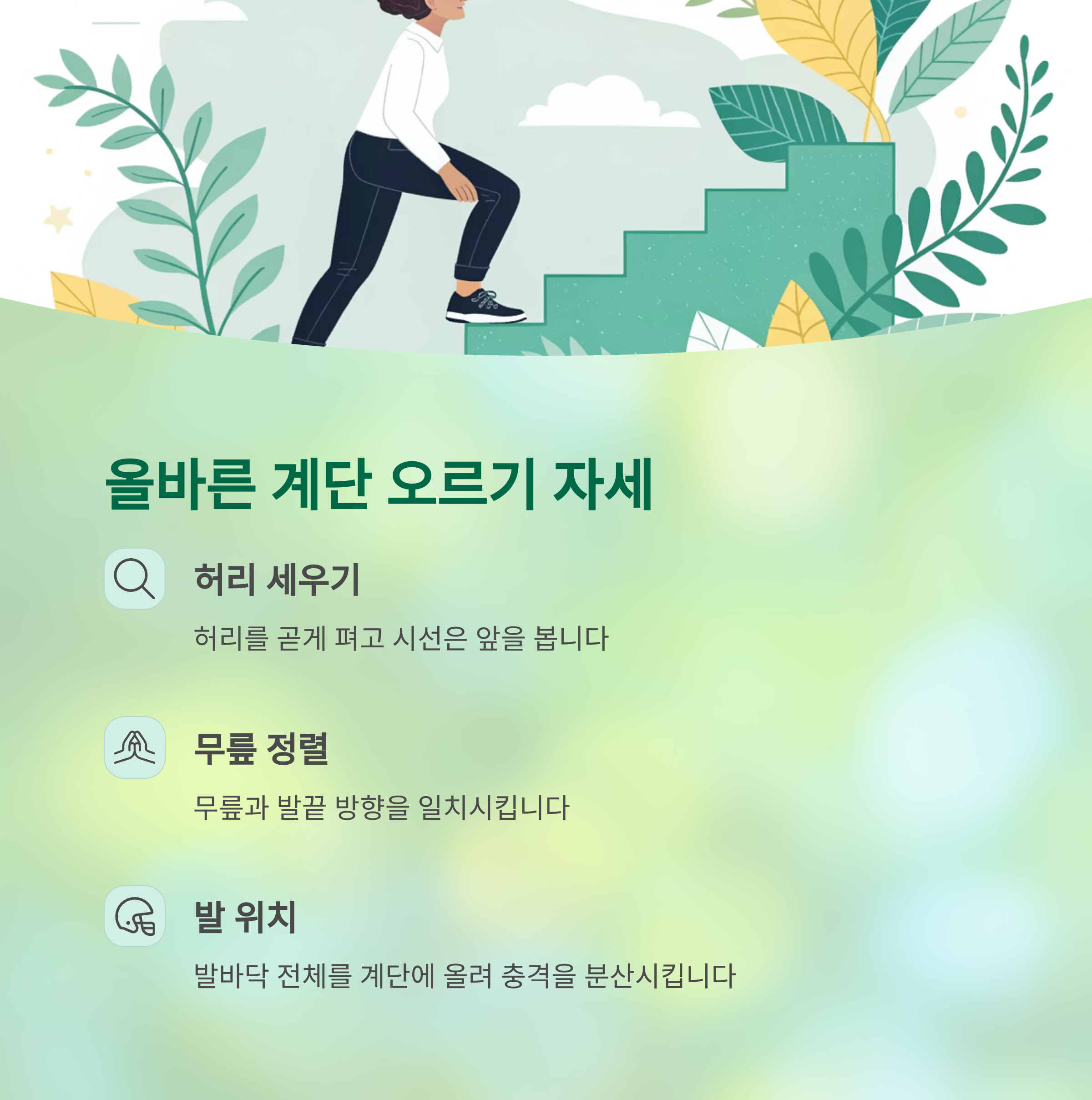 특히 계단 오르기는 관절에 큰 부담을 주기 때문에 바른 습관이 중요합니다