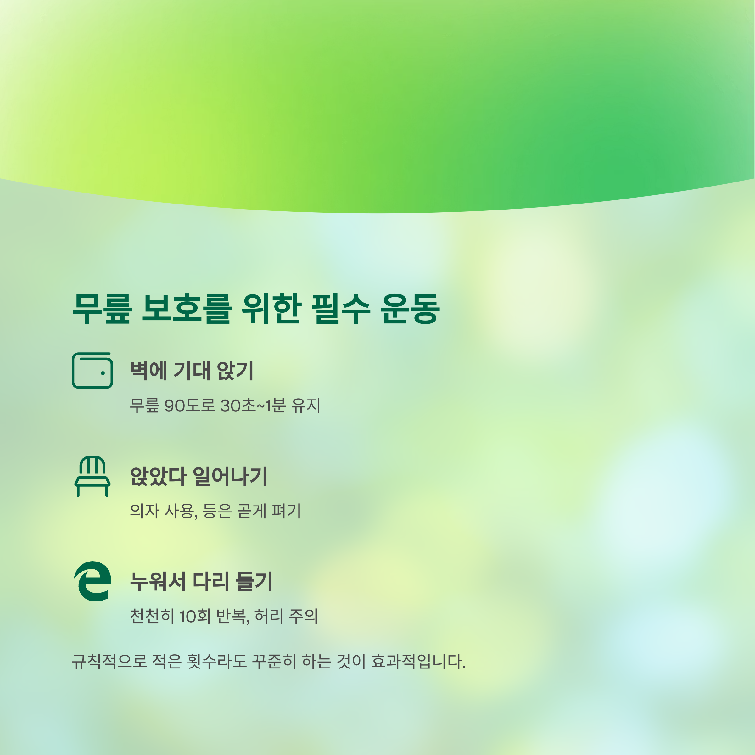 | 벽에 기대 앉기 | 30초~1분 유지 | 무릎 90도 각도 유지 |