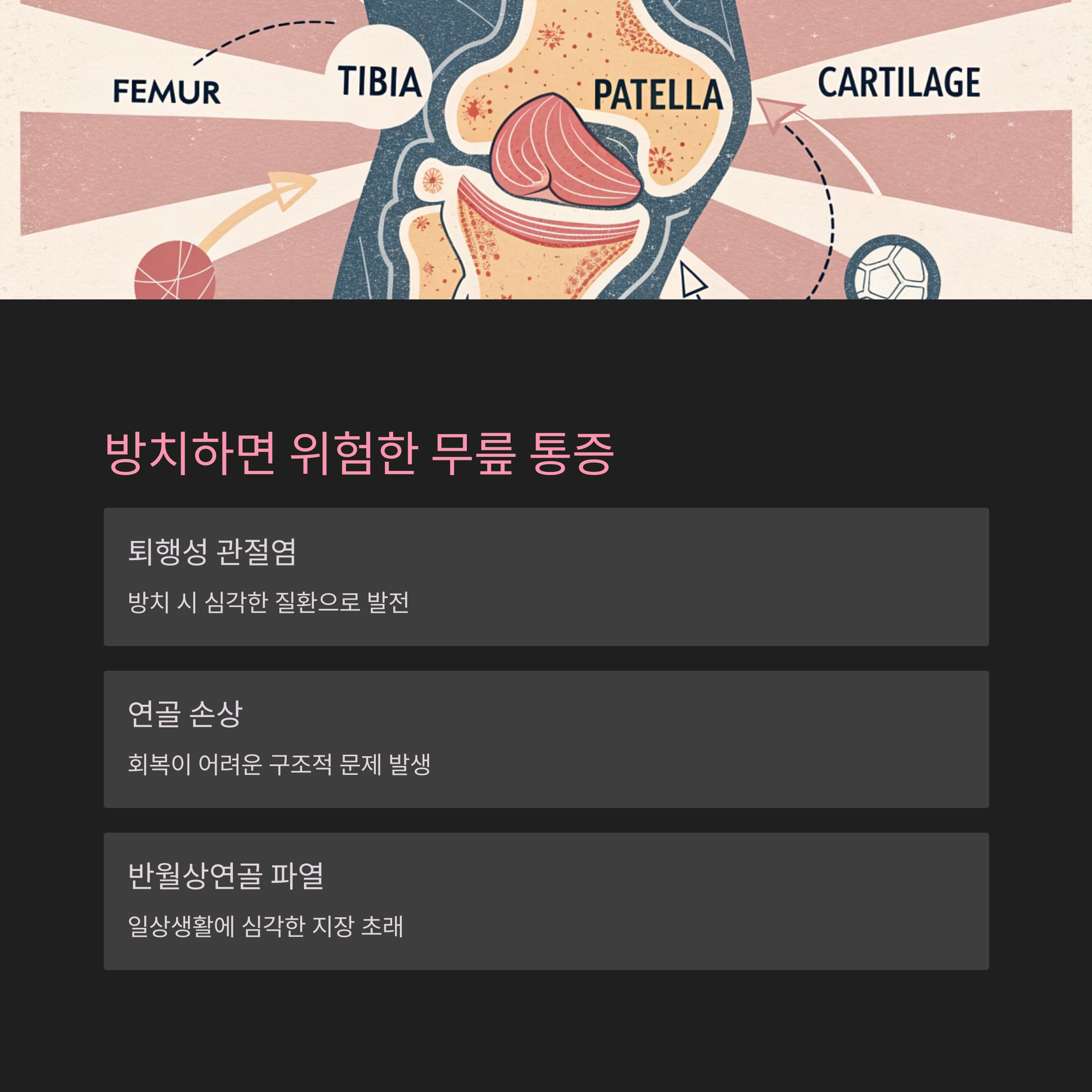 방치할 경우 퇴행성 관절염, 연골 손상, 반월상연골 파열 등 심각한 질환으로 발전할 수 있습니다