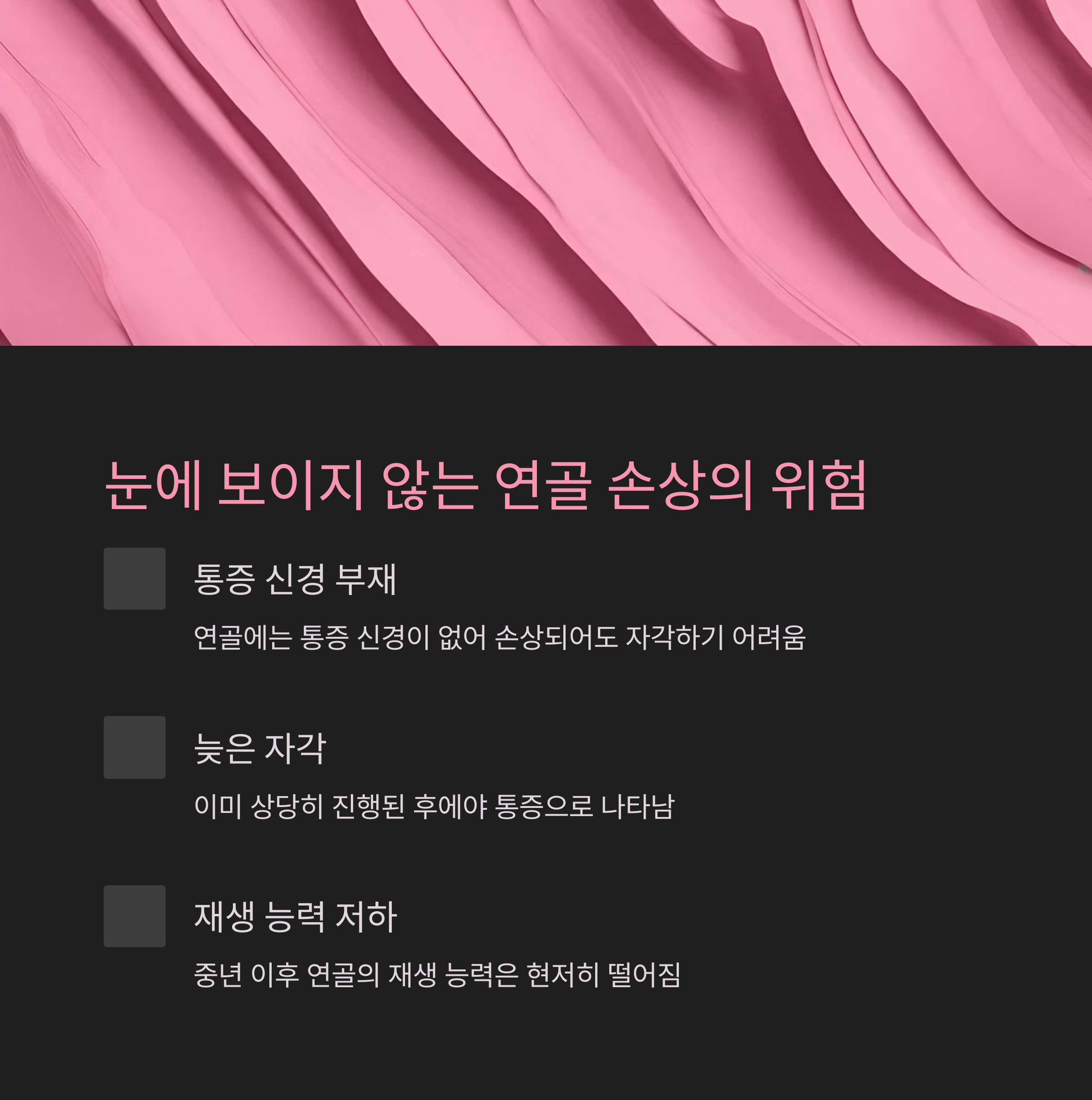 연골은 통증 신경이 없어 손상되어도 자각하기 어렵고