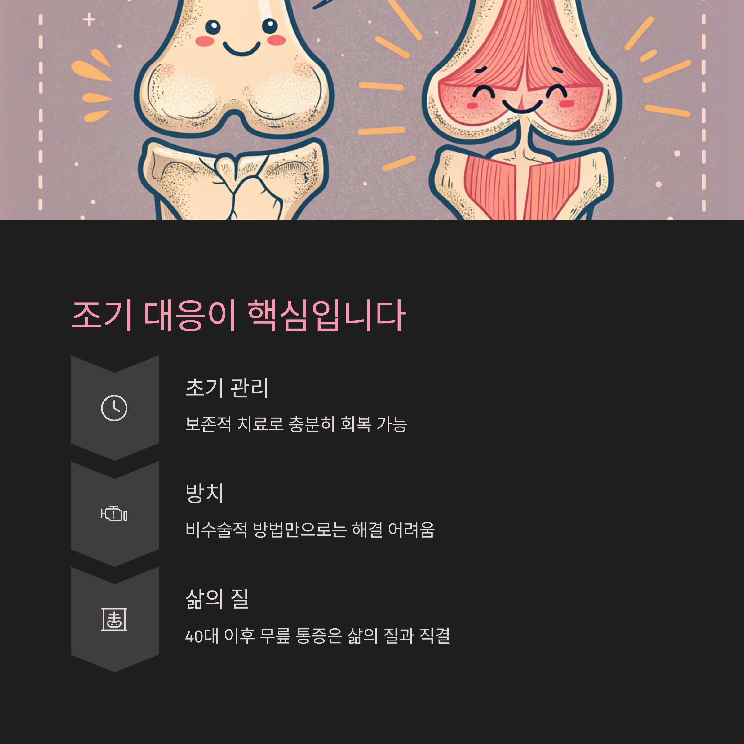 이로 인해 통증의 만성화, 운동 기능 저하, 심하면 인공관절 수술까지 이어질 수 있습니다