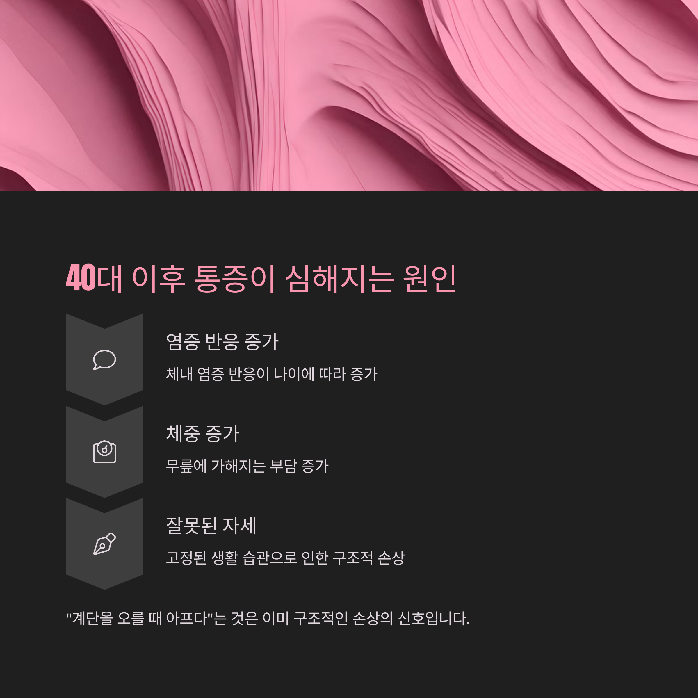"계단을 오를 때 아프다"는 것은 이미 구조적인 손상이 시작된 신호입니다