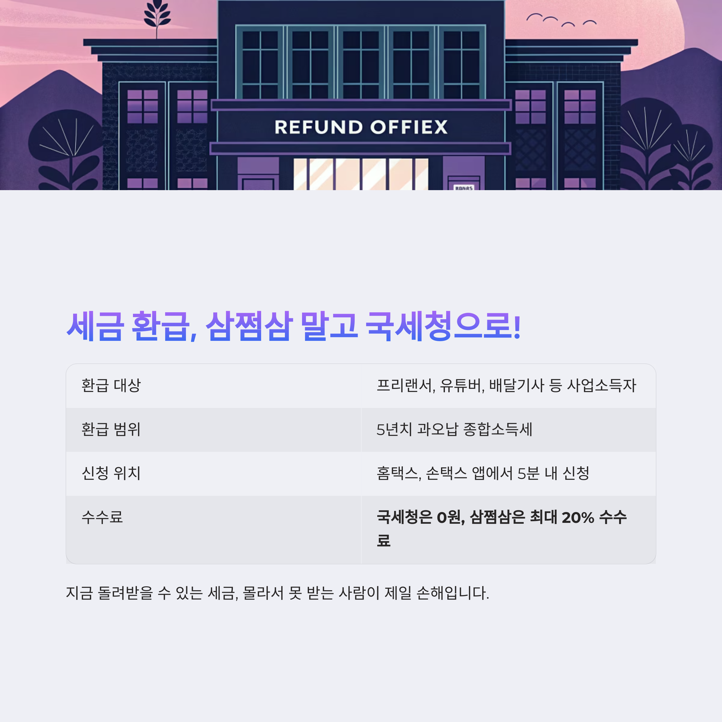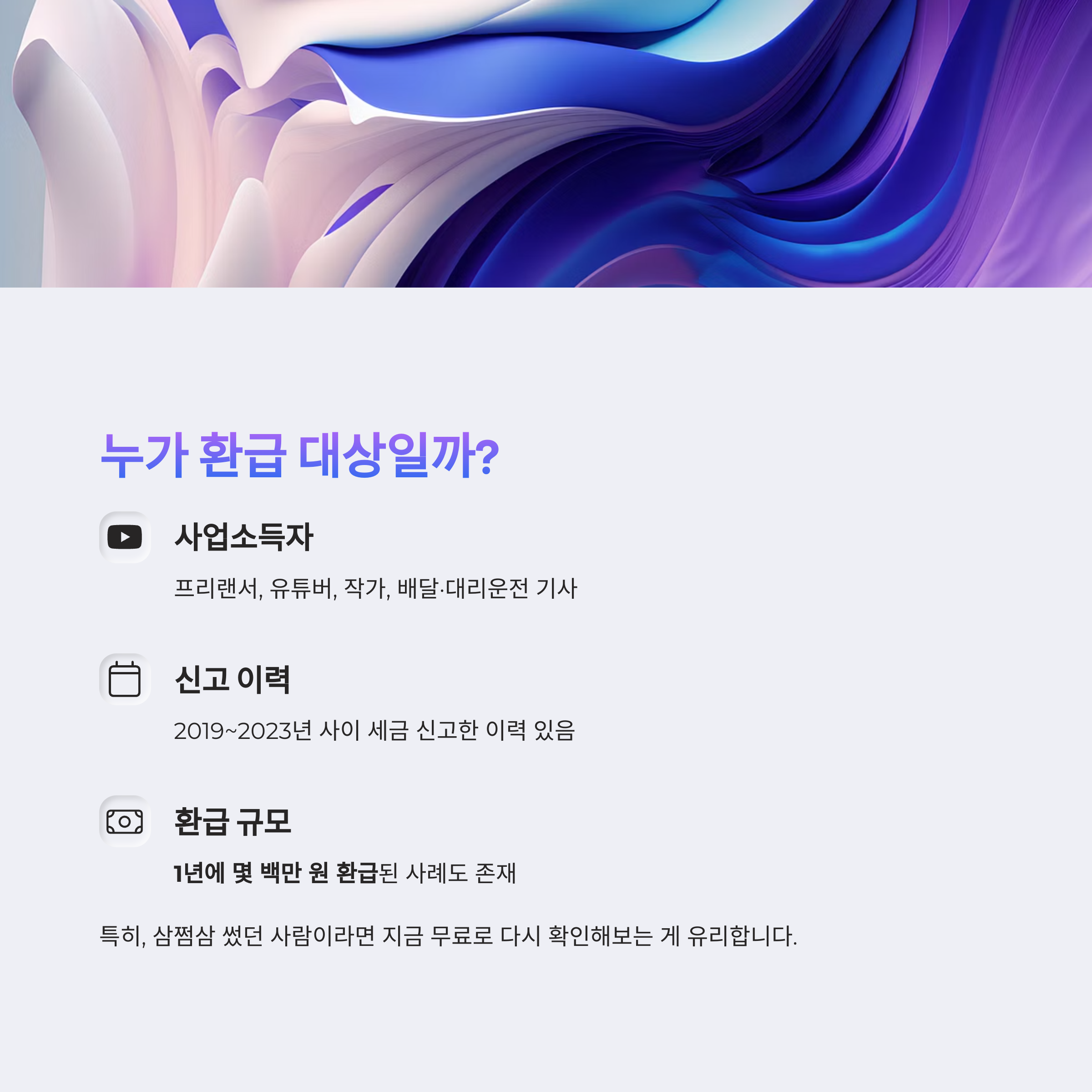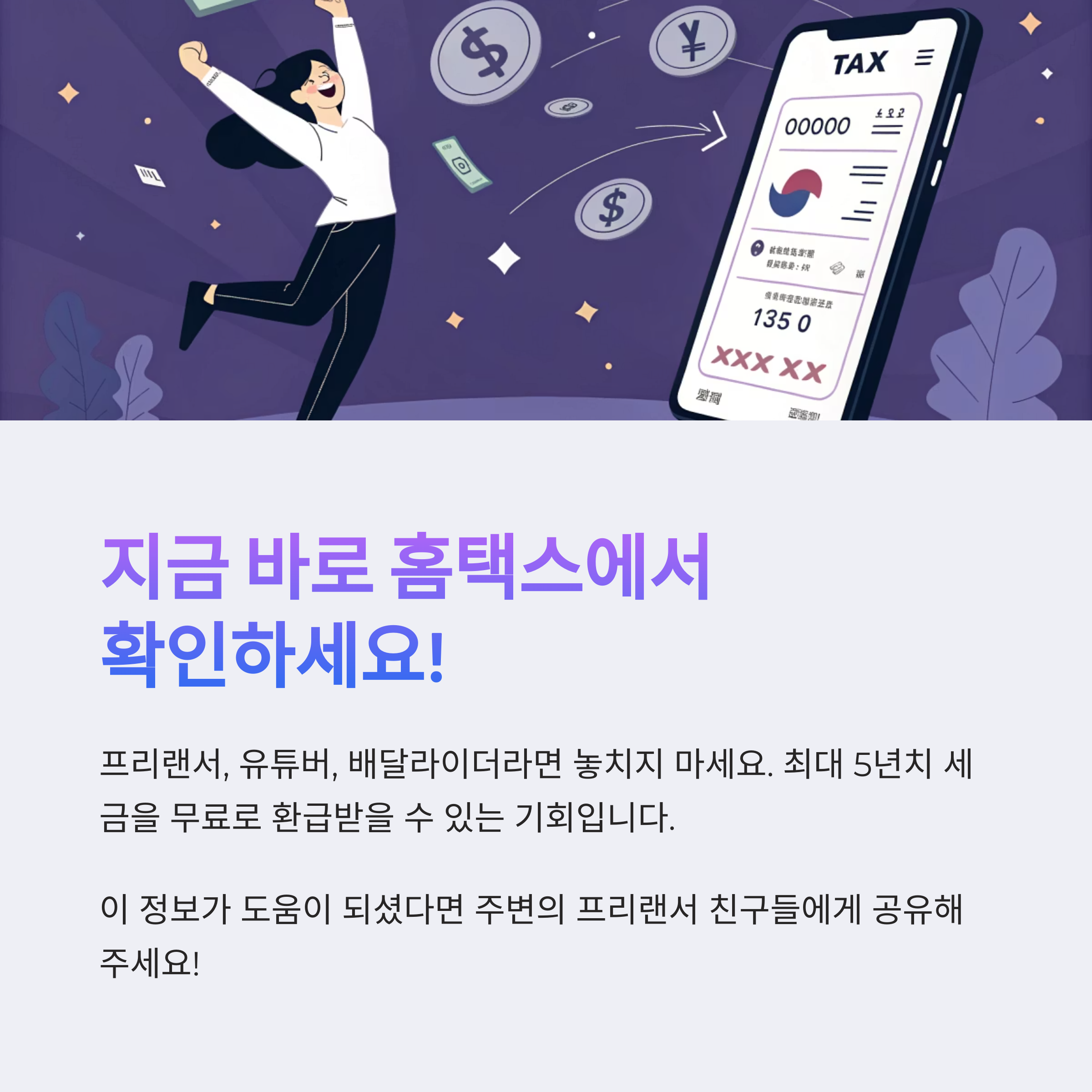 | 환급 대상 | 프리랜서, 유튜버, 배달기사 등 사업소득자 |