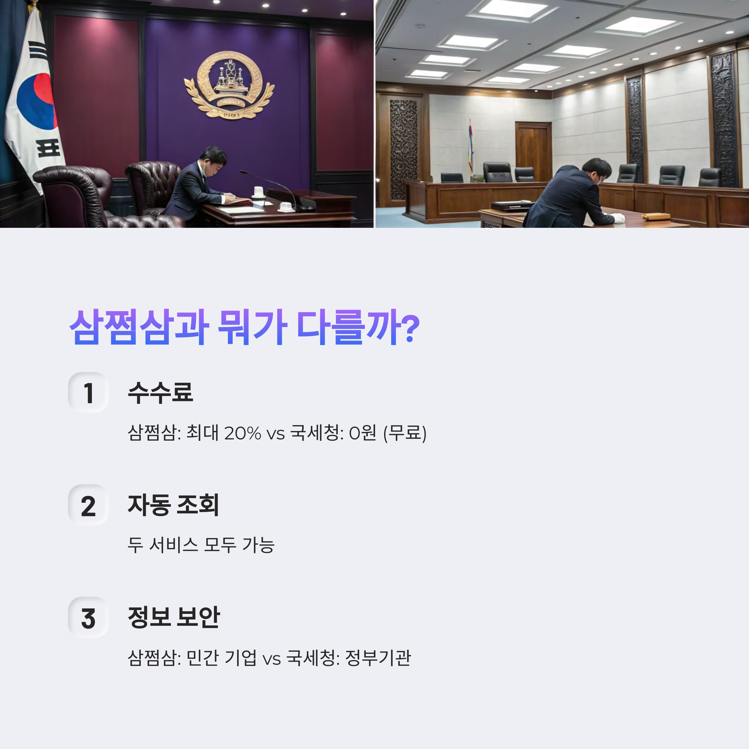 | 수수료 여부 | 국세청은 0원 (무료), 삼쩜삼은 최대 20% 수수료 |