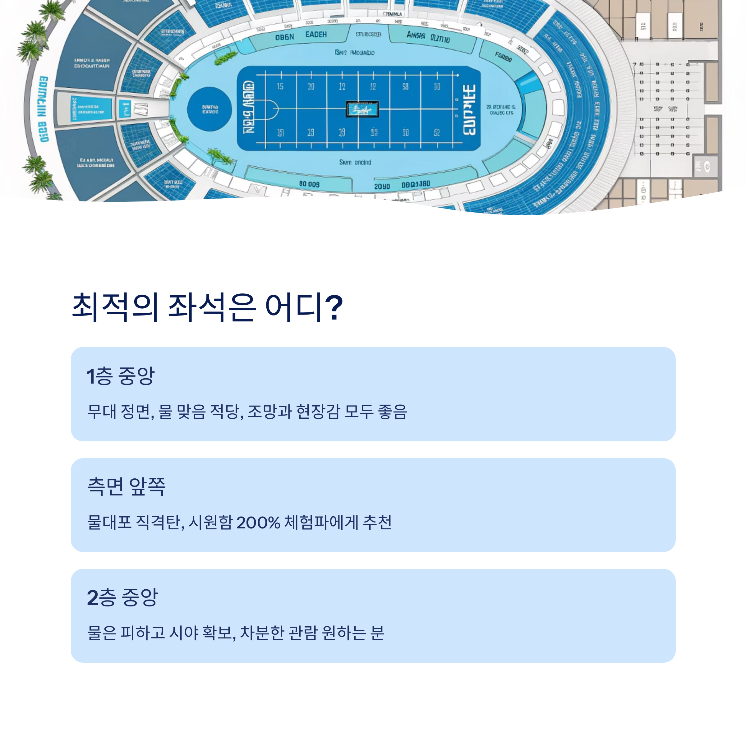 | 1층 중앙 | 무대 정면, 물 맞음 적당 | 조망+현장감 모두 원하는 분 |