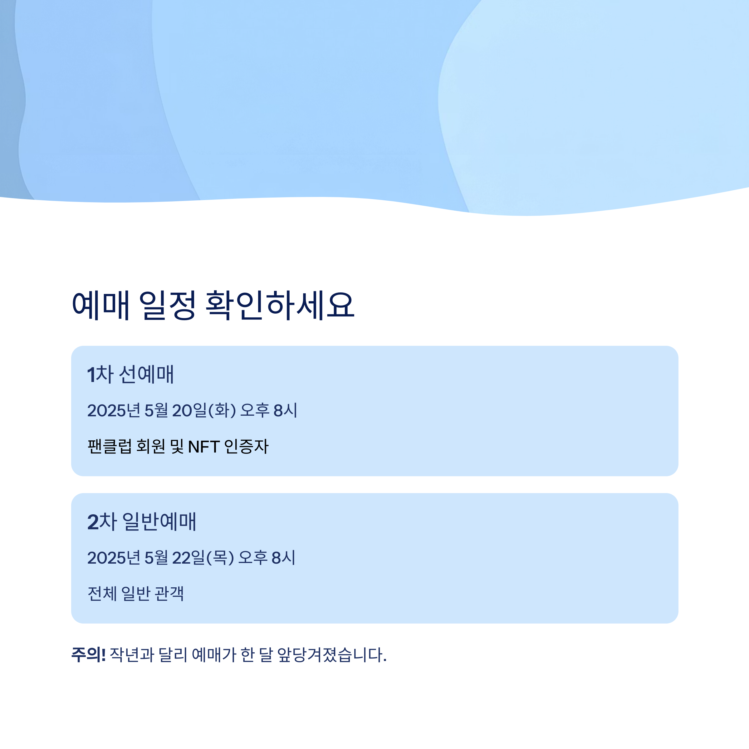 | 1차 선예매 | 2025년 5월 20일(화) | 오후 8시 | 팬클럽 회원 및 NFT 사전 인증자 |