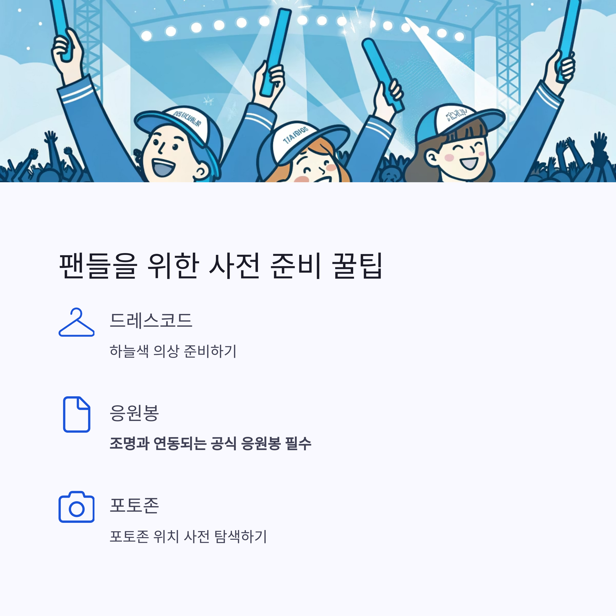 하늘색 드레스코드, 공식 응원봉, 포토존 위치 사전 탐색은 필수 준비물입니다.