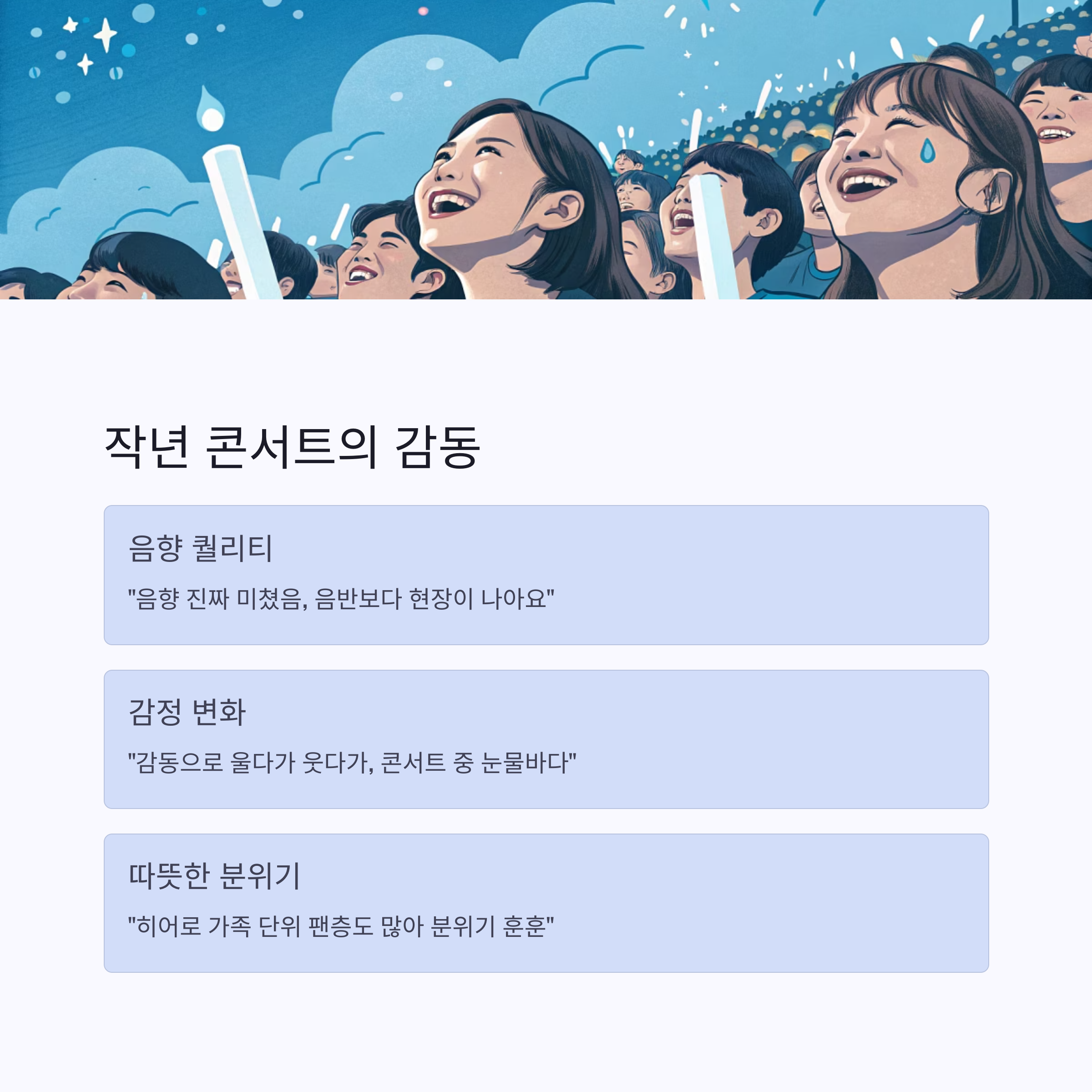2024년 콘서트를 경험한 팬들의 후기는 하나같이 현장감과 몰입감이 최고였다고 평가했습니다.