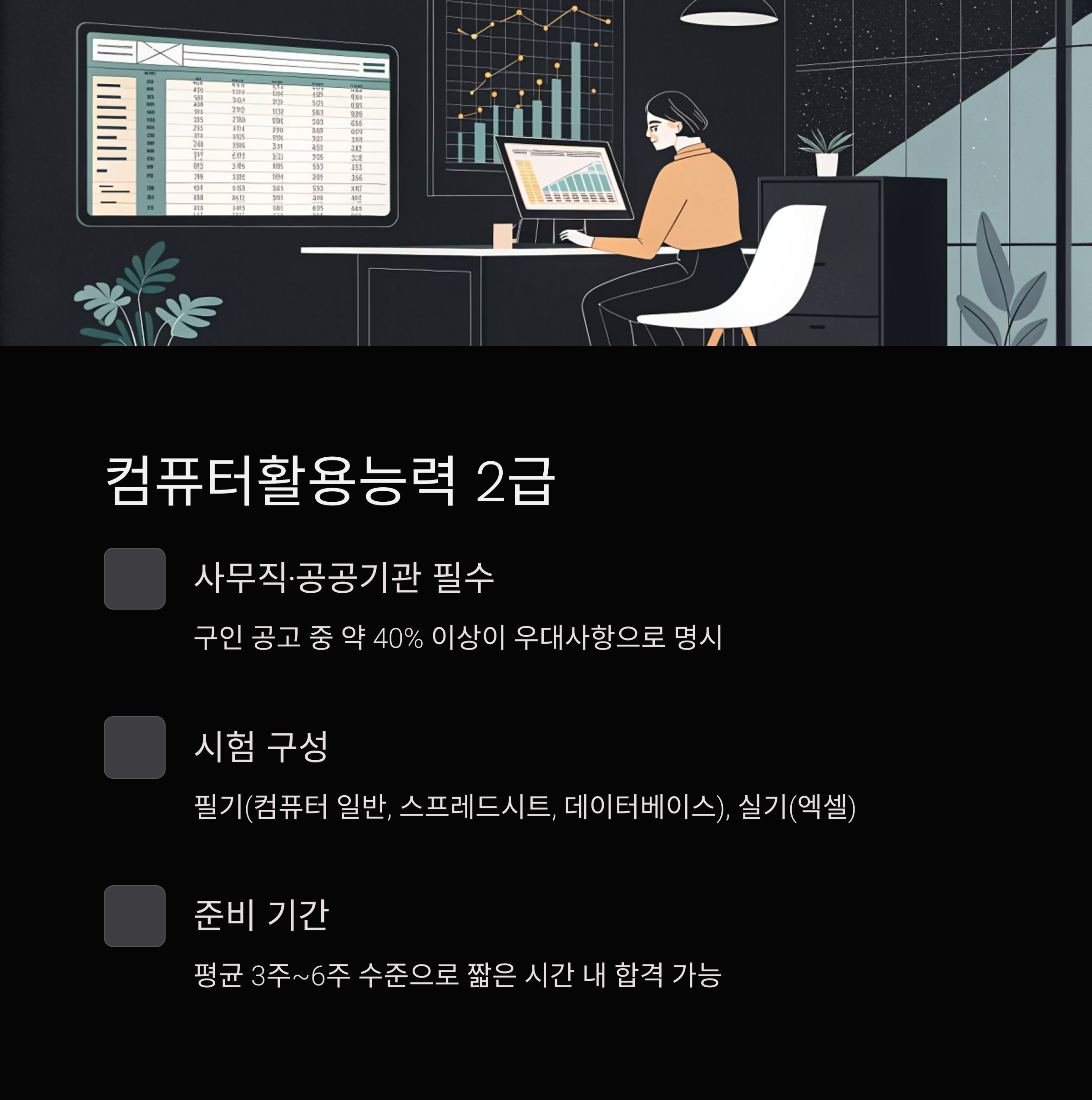 사무직 기본 | 컴활 2급 | 3~6주 | 실무 엑셀 + 공공기관 유리 |
