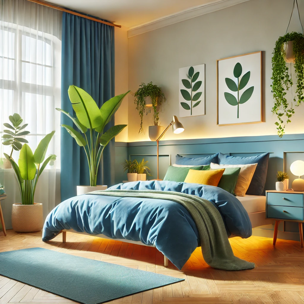 - 침구류 교체: 차분한 파란색 계열로 선택