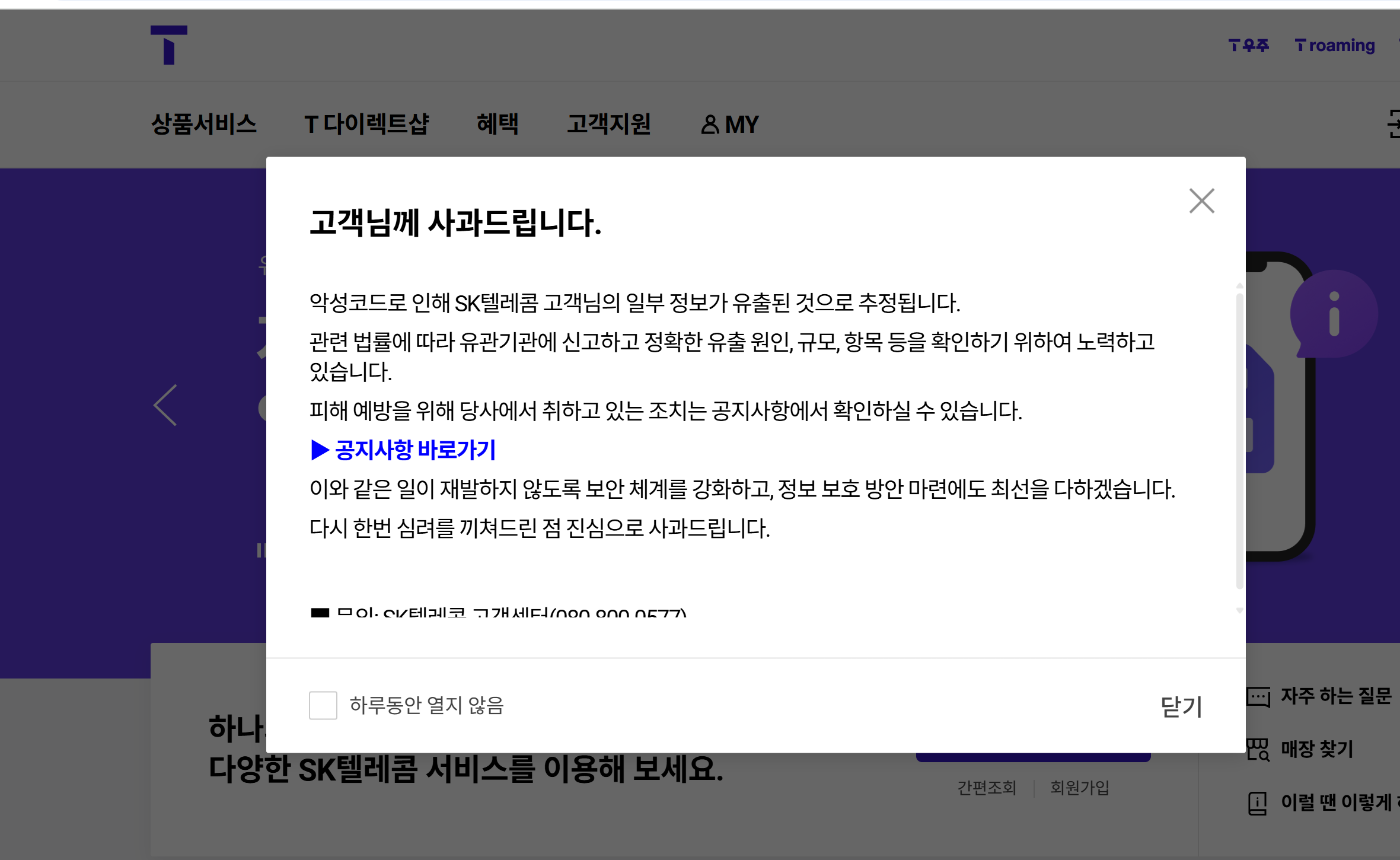 SK텔레콤 홈페이지에 올라온 사과문 공지👇