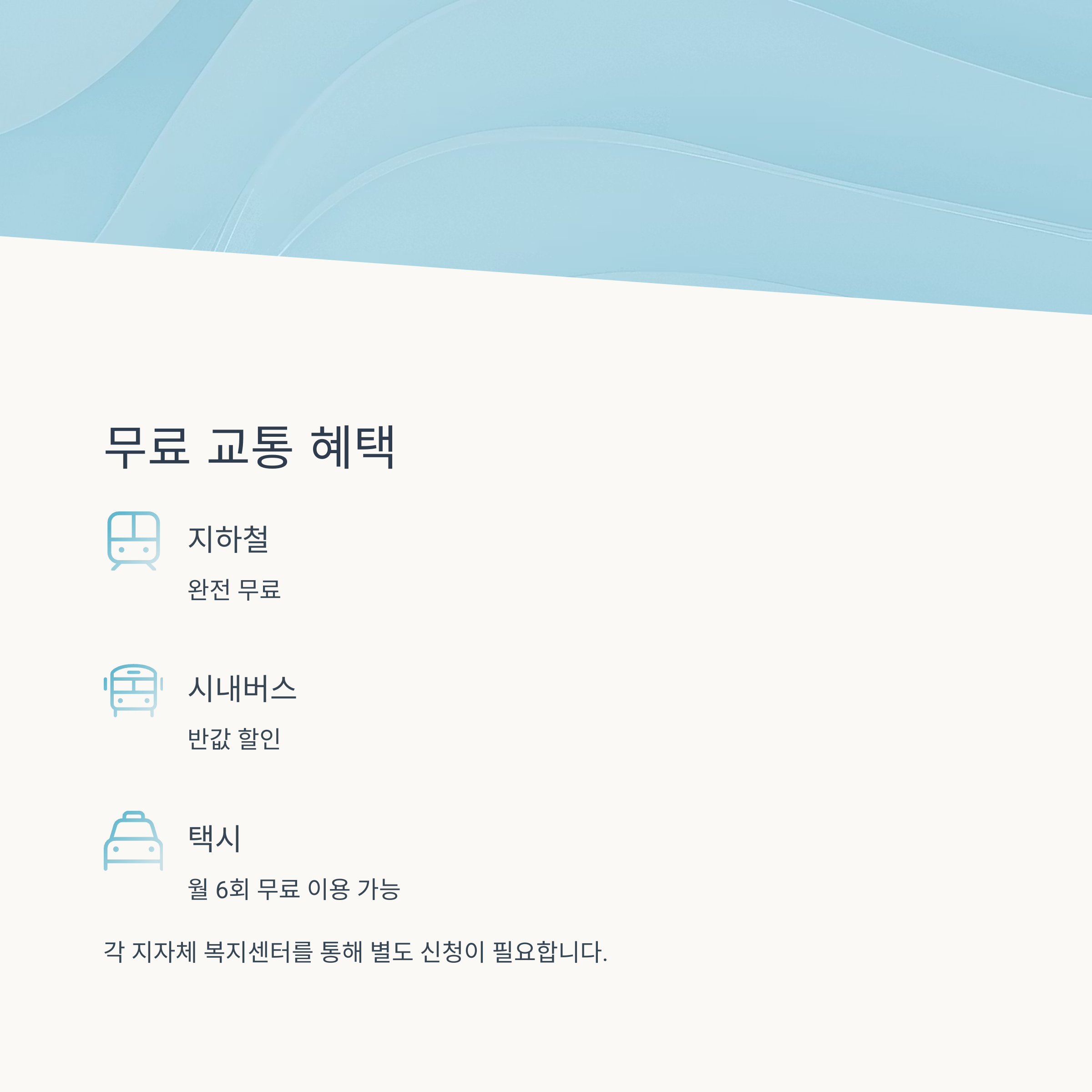 | 교통비 지원 | 지자체별 상이 | 버스, 지하철 무료, 택시 지원 등 |