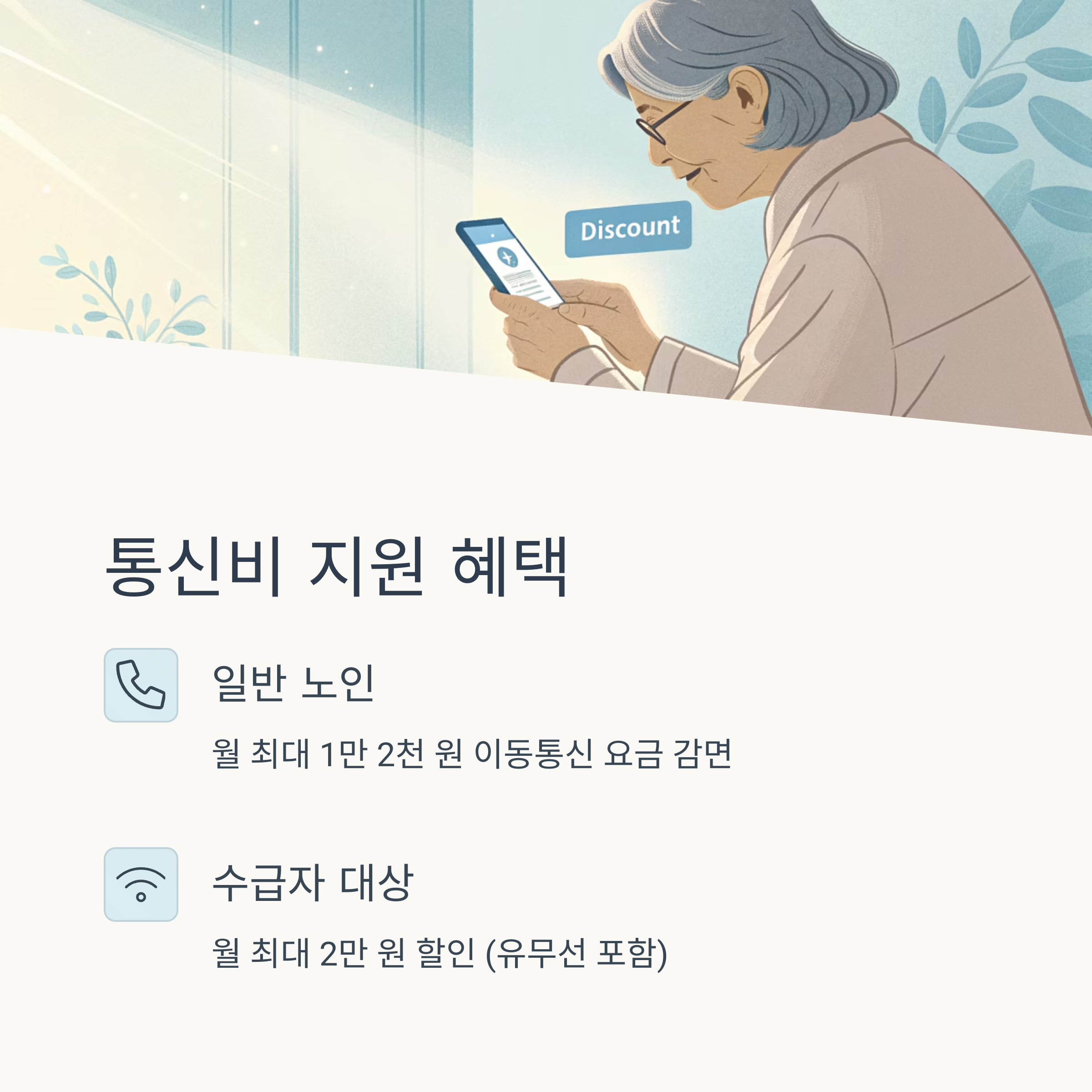 | 일반노인 | 월 최대 1만 2천 원 할인 | 통신 3사 공통 |