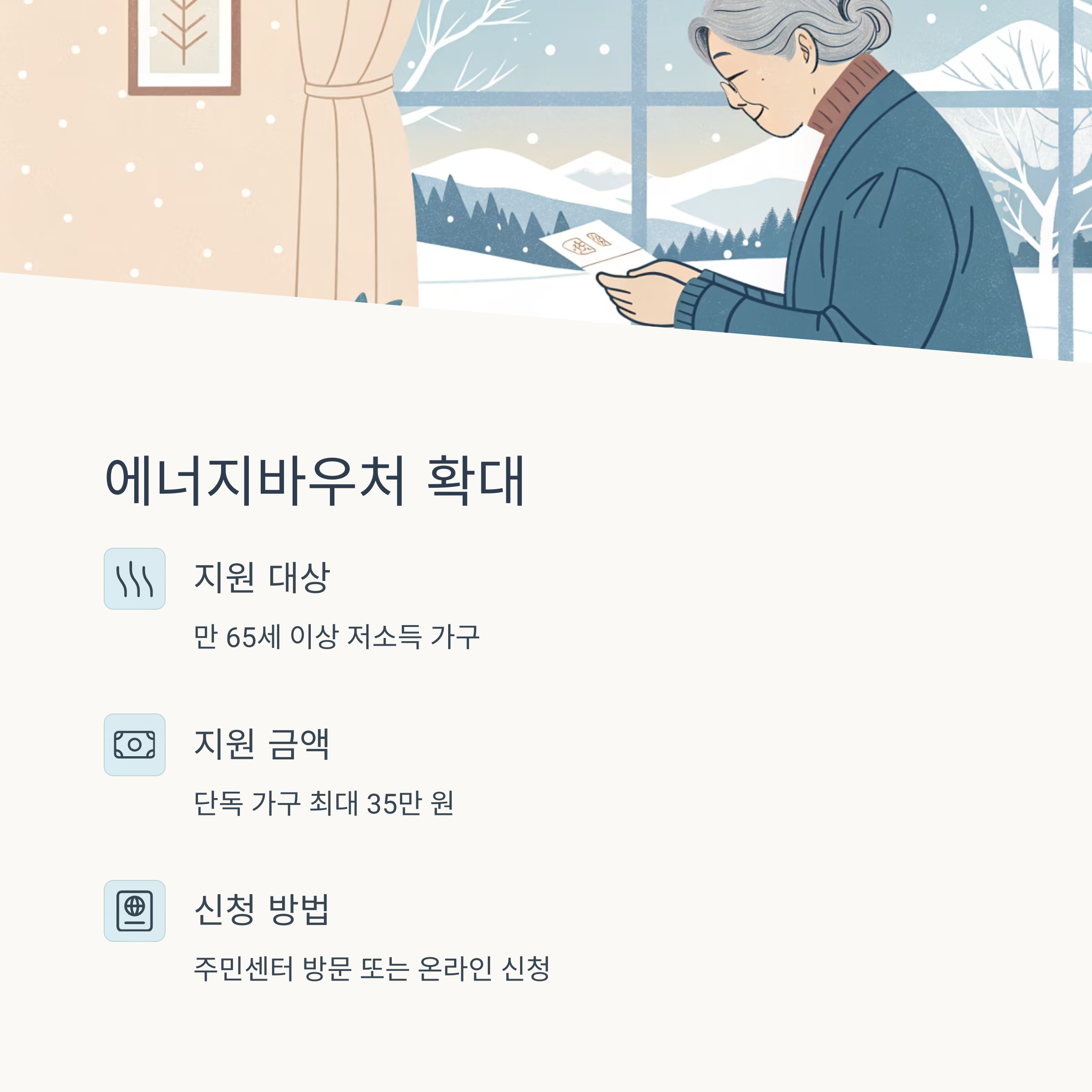 | 에너지 바우처 | 저소득 노인가구 | 동절기 최대 35만 원 요금 감면 |