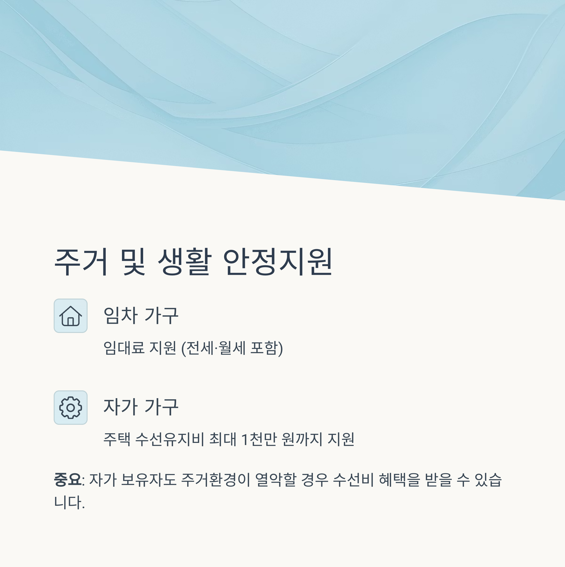 | 자가 가구 | 주택 수선유지비 지원 | 최대 1천만 원까지 가능 |