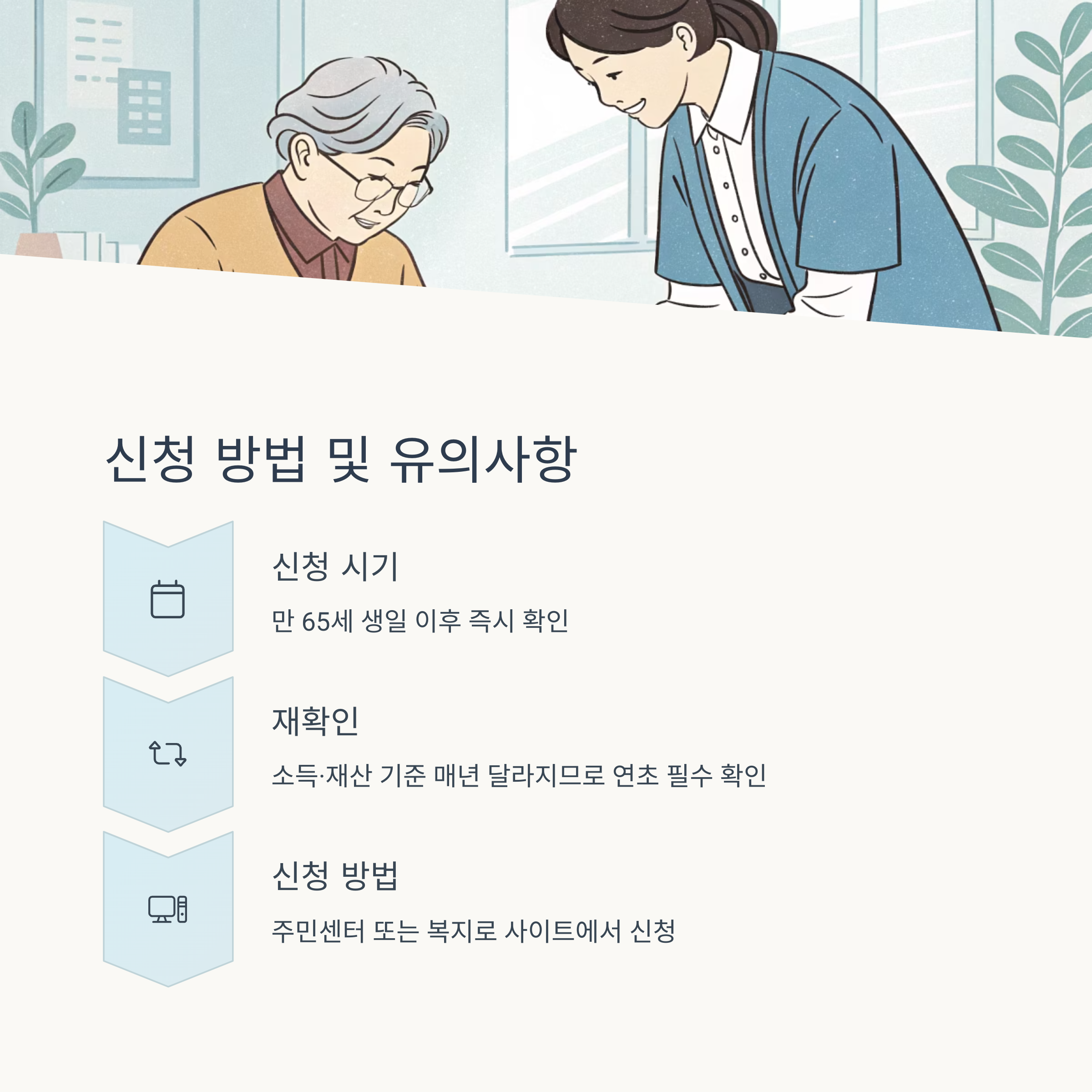 - 소득과 재산 기준이 매년 달라지므로 연초 재확인 필수