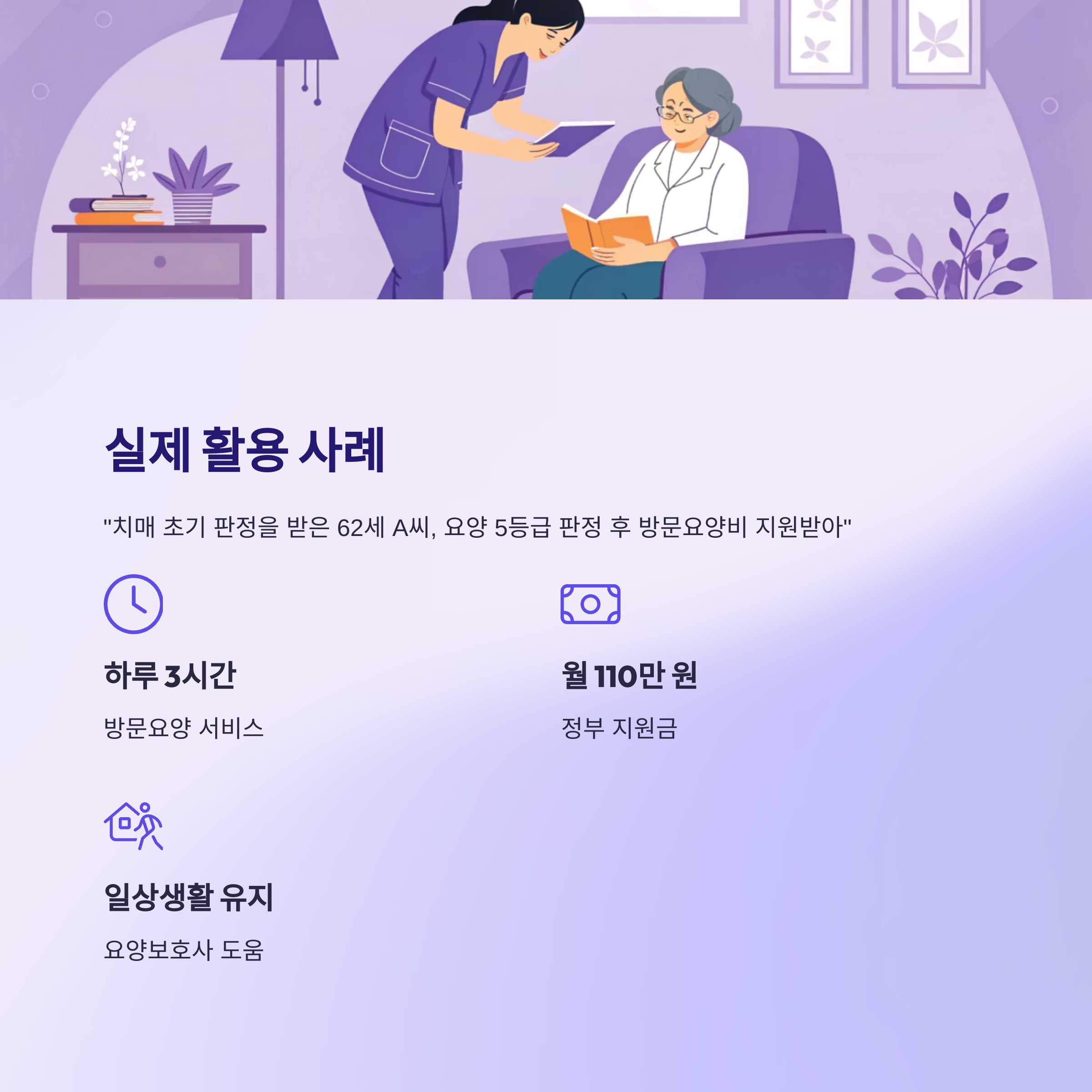 "치매 초기 판정을 받은 62세 A씨, 요양 5등급 판정 후 방문요양비 지원받아"