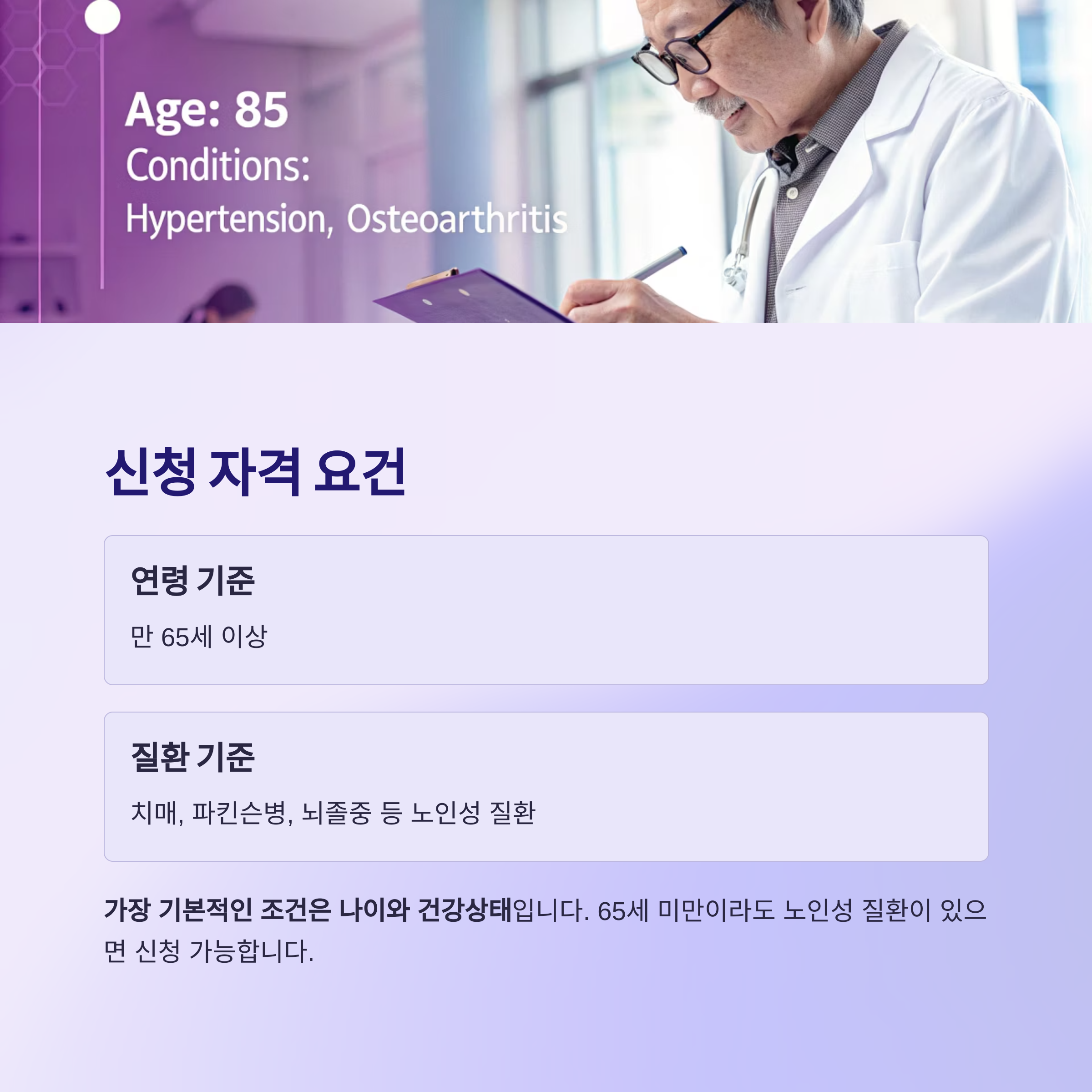 그 이하라도 치매, 파킨슨병, 뇌졸중 등 노인성 질환을 앓고 있다면 예외적으로 신청이 가능합니다