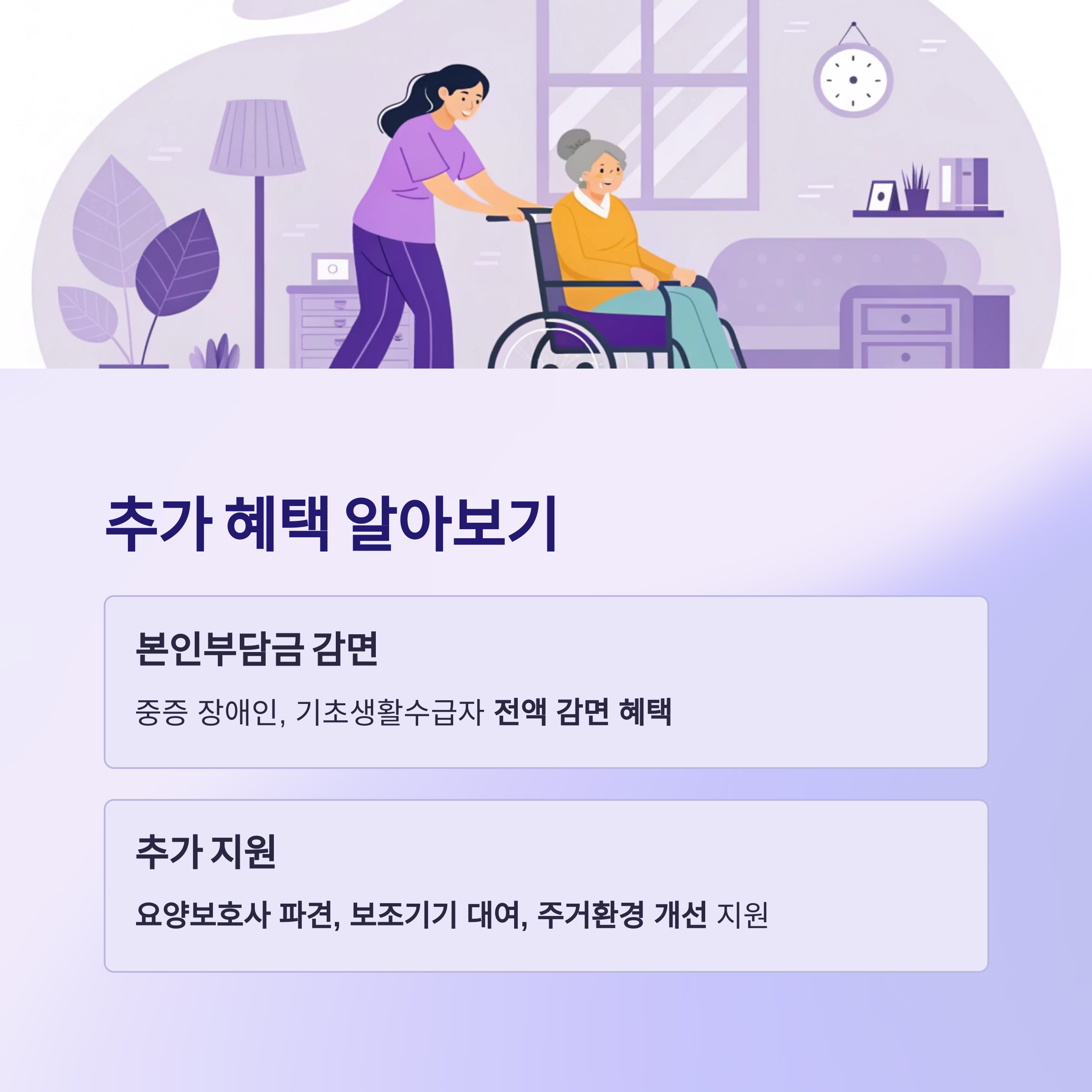 이외에도 요양보호사 파견, 보조기기 대여, 주거환경 개선 비용 등 다양한 추가 지원이 제공됩니다