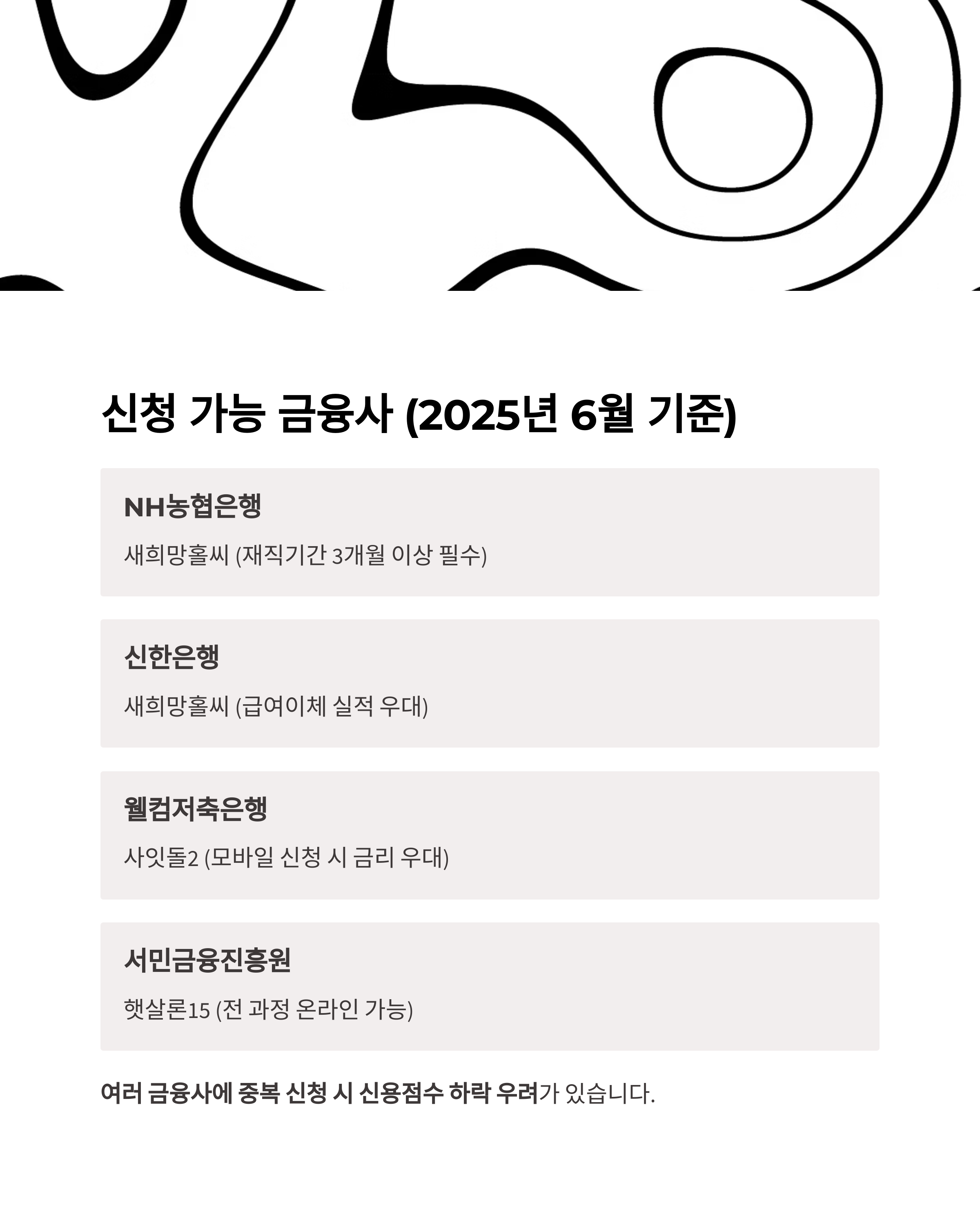 중요 팁: 여러 금융사에 중복으로 신청할 경우 신용점수 하락 우려 있으므로 1~2개 금융사에 신중히 신청하는 것이 좋습니다