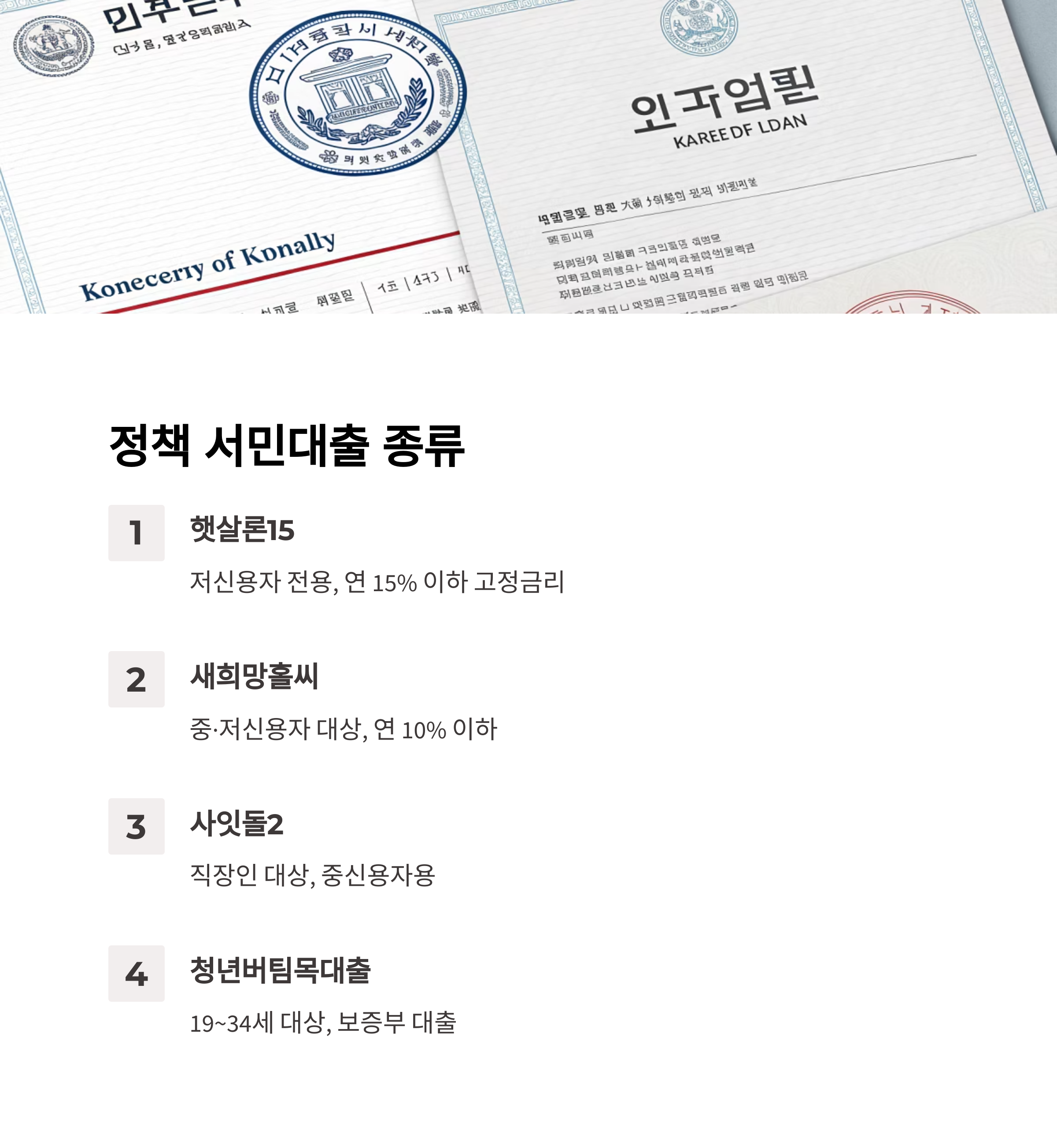 | 새희망홀씨 | 중·저신용자 대상, 연 10% 이하 | 은행권 (농협, 국민은행 등) |