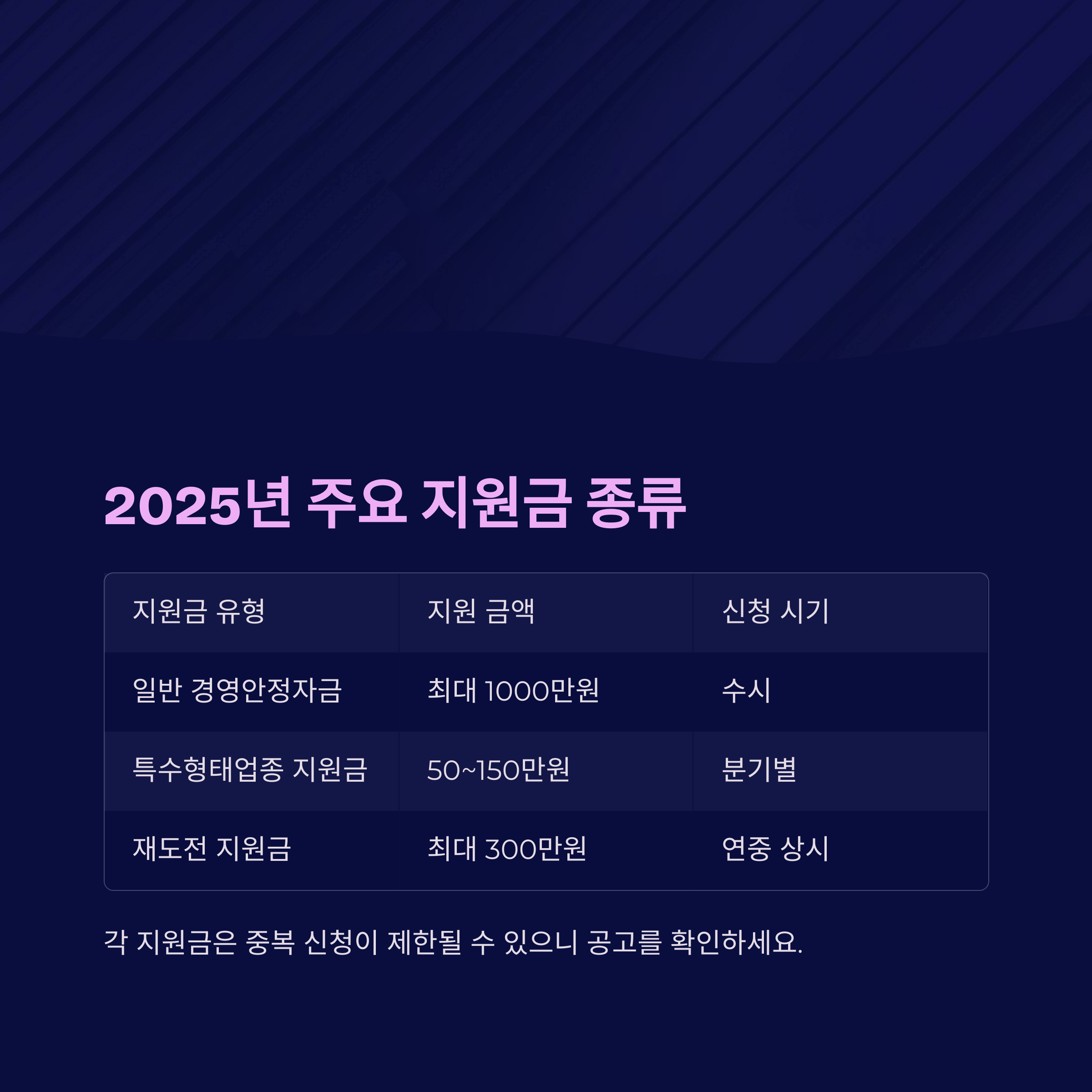 "각 지원금은 중복 신청이 제한될 수 있으며, 반드시 신청 공고를 확인해야 합니다"