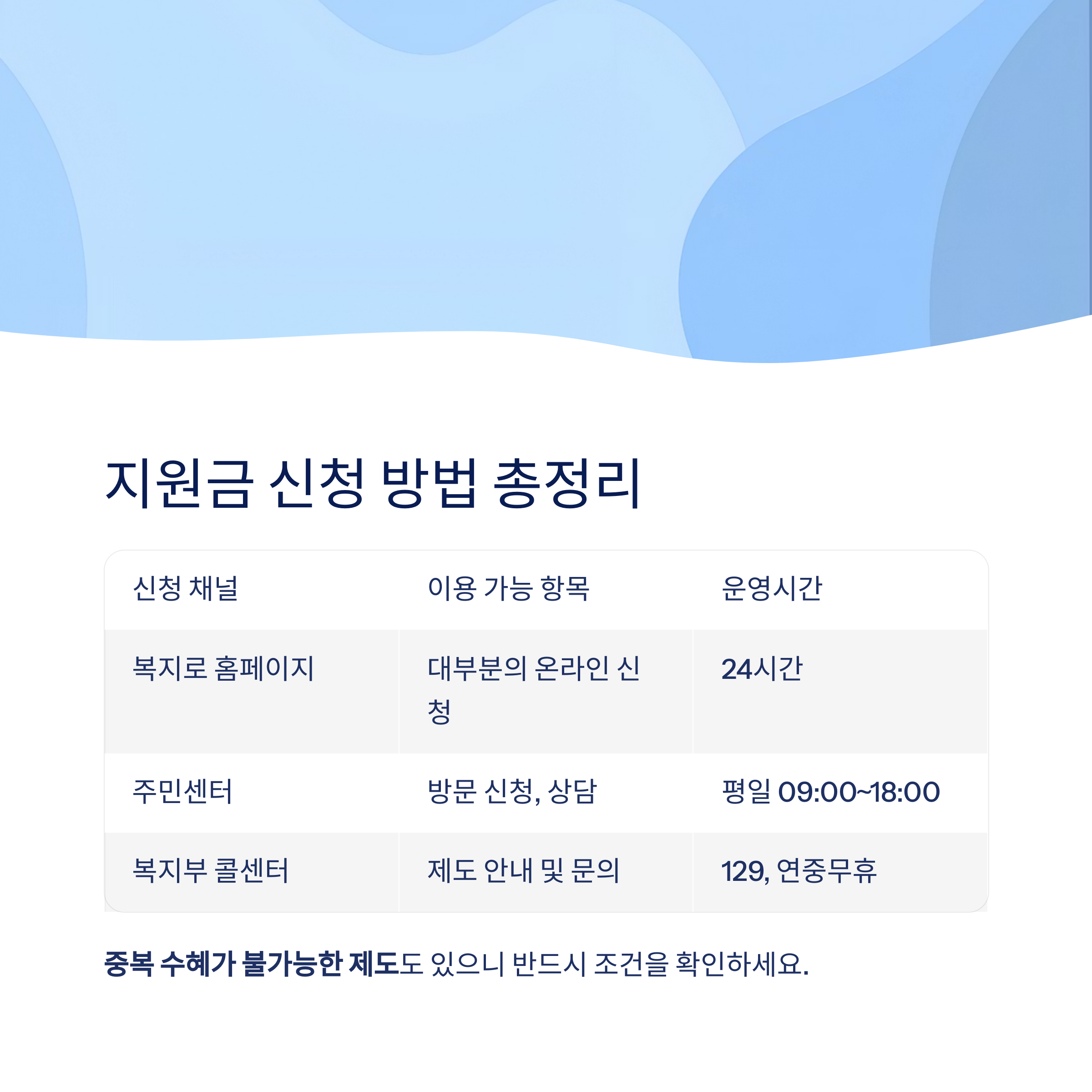 중복 수혜가 불가능한 제도도 있으므로 반드시 조건을 확인한 후 신청해야 합니다.