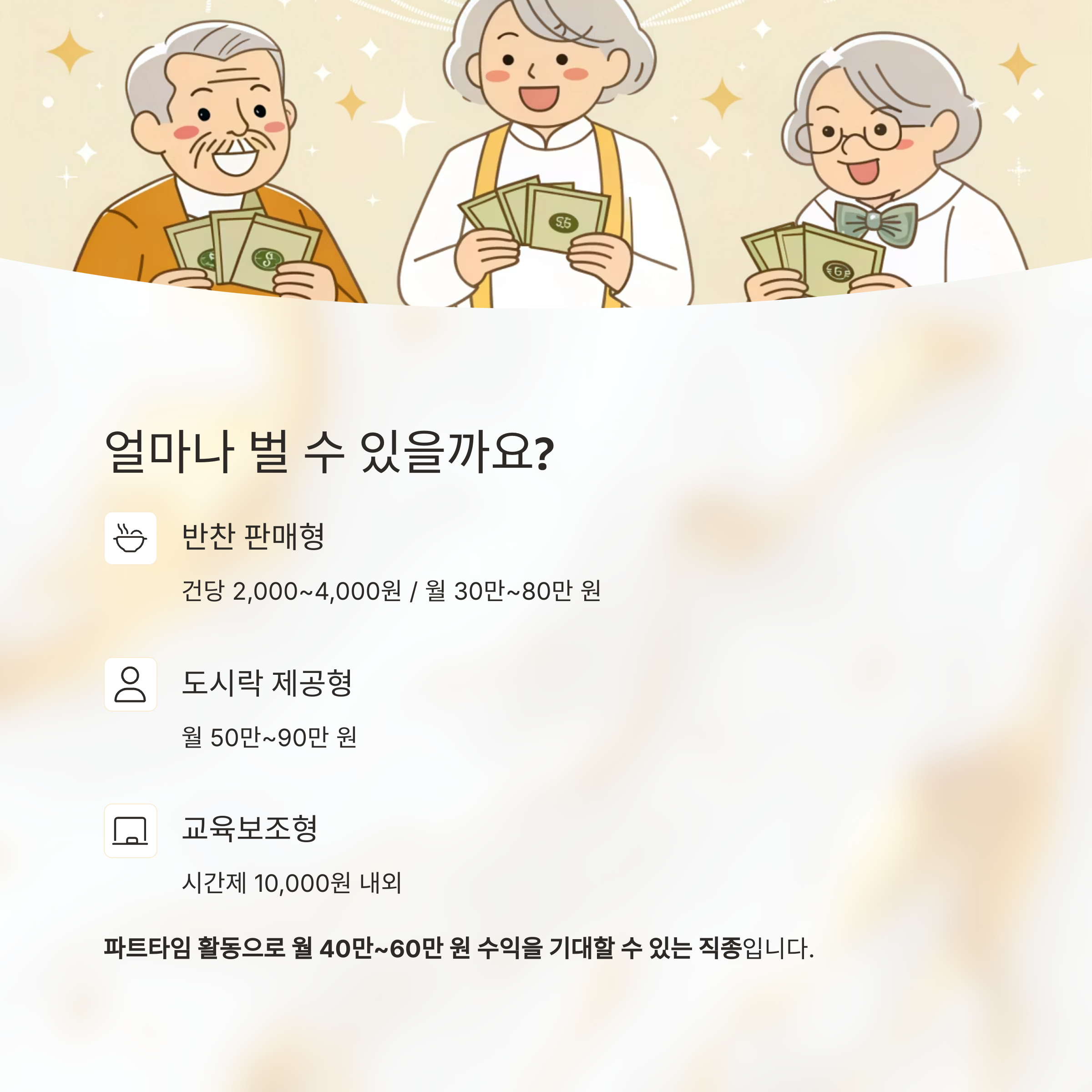 | 반찬 판매형 | 건당 2,000원~4,000원 / 월 30만~80만 원 | 공동 조리 후 판매 |