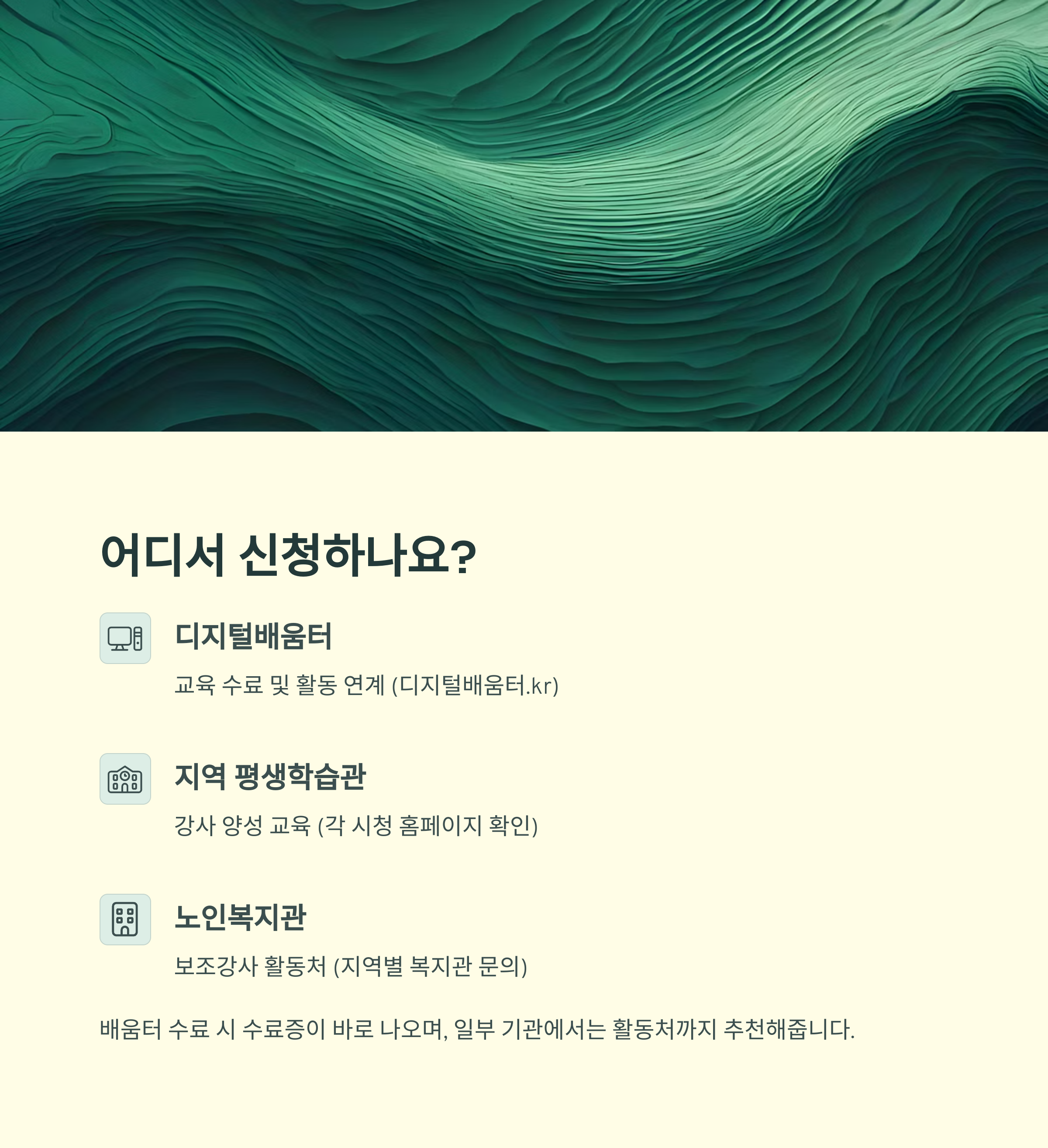 지역 배움터나 복지기관에서 제공하는 교육 수료만으로 활동이 가능합니다.