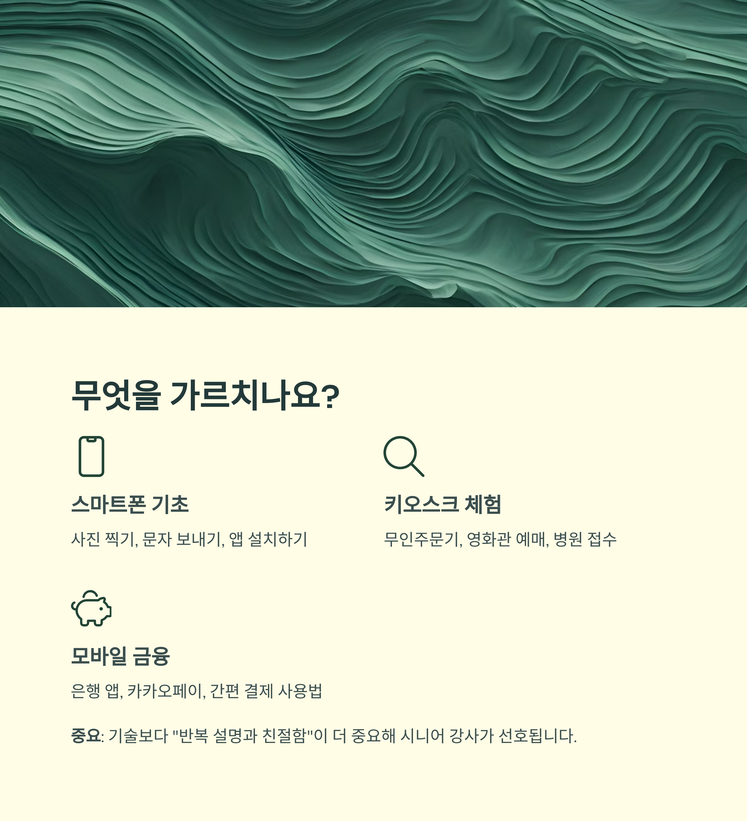 | 스마트폰 기초 | 사진 찍기, 문자 보내기, 앱 설치 |