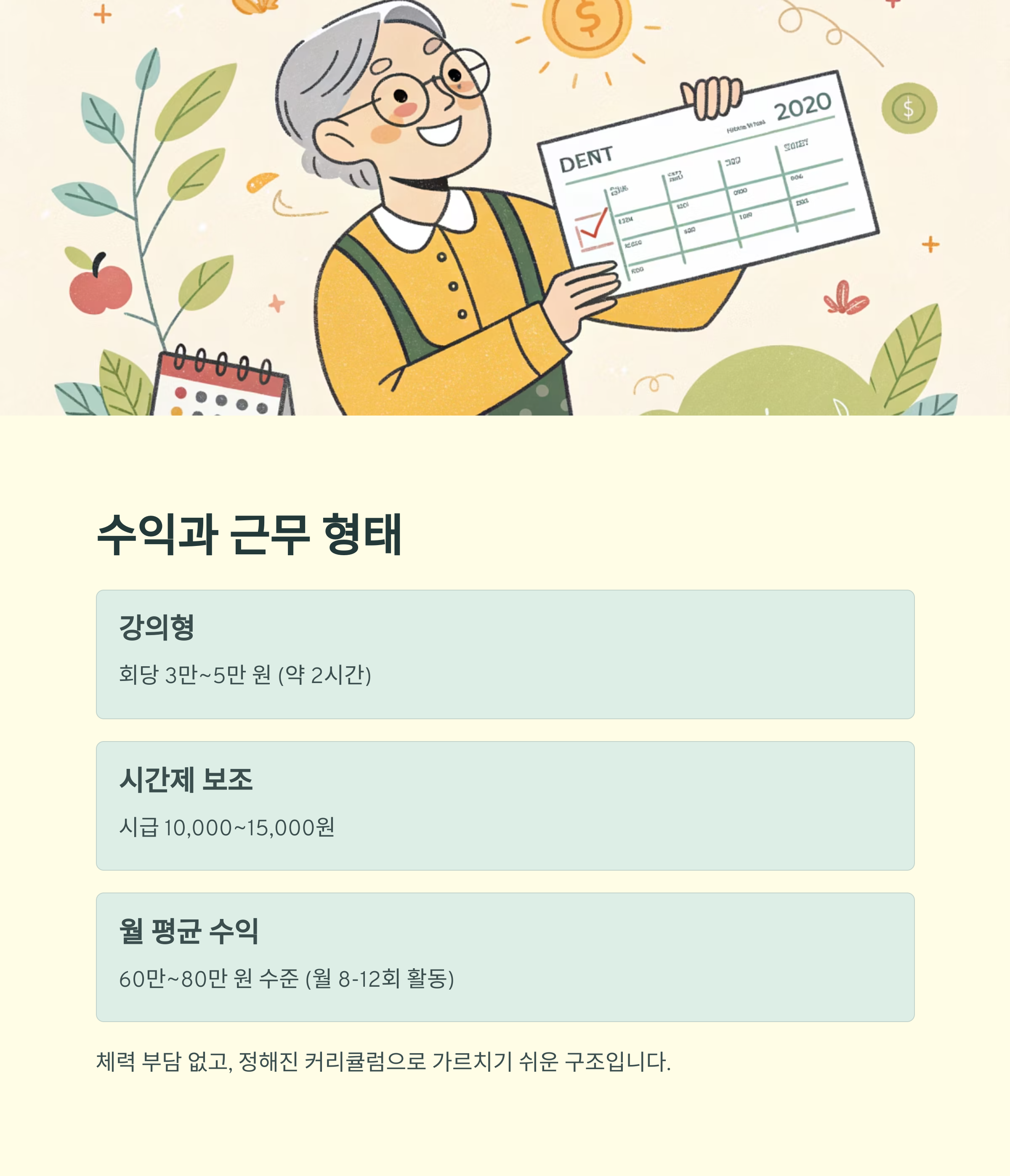 현재 시니어 대상 직무 중 가장 진입장벽이 낮고 보람 있는 직종으로 주목받고 있습니다.
