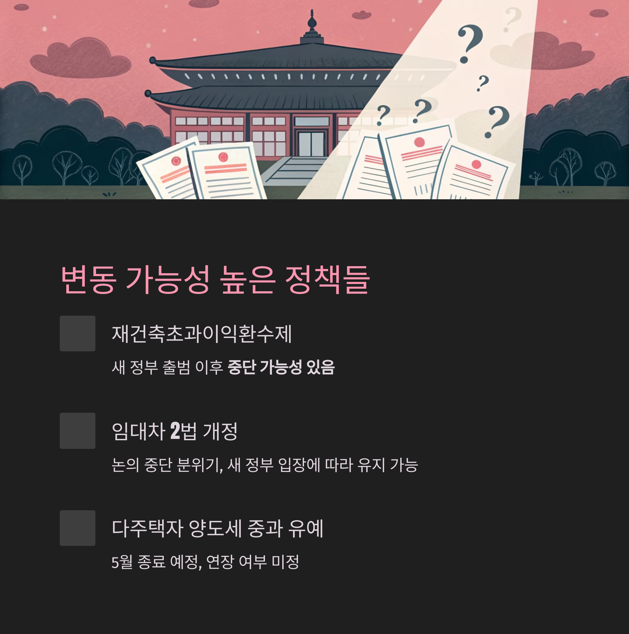 이 항목들은 실제 정부 발표는 없지만, 정치 지형 변화로 변동 가능성이 매우 높아 주의가 필요합니다.