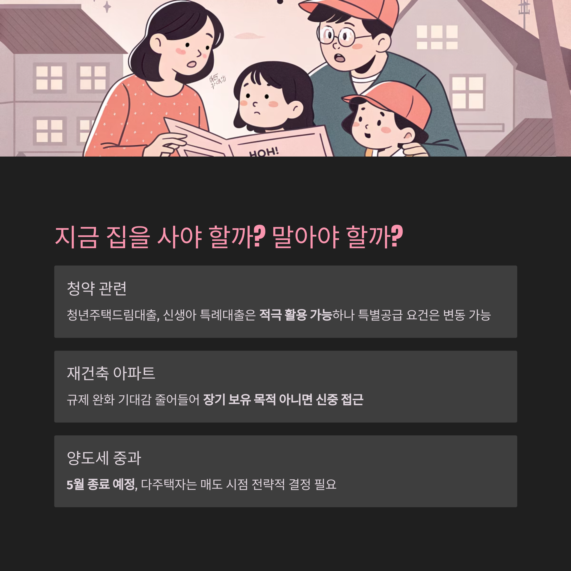 | 다주택자 양도세 중과 유예 연장 | 5월 종료 예정, 연장 여부 미정 → 조기 매도 전략 필요 |