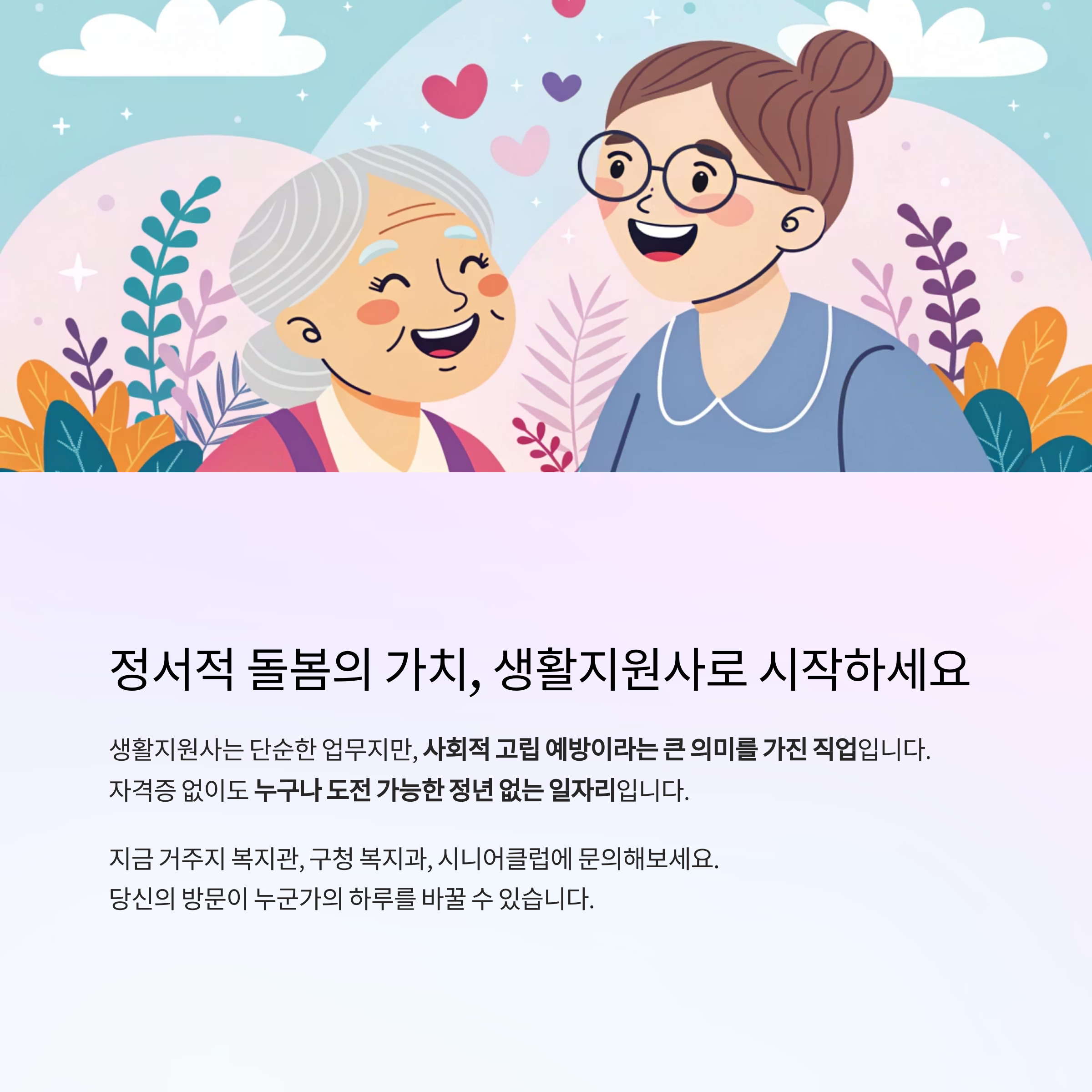 📌 마무리: 생활지원사는 ‘정서적 돌봄’ 중심의 실속 있는 일자리입니다