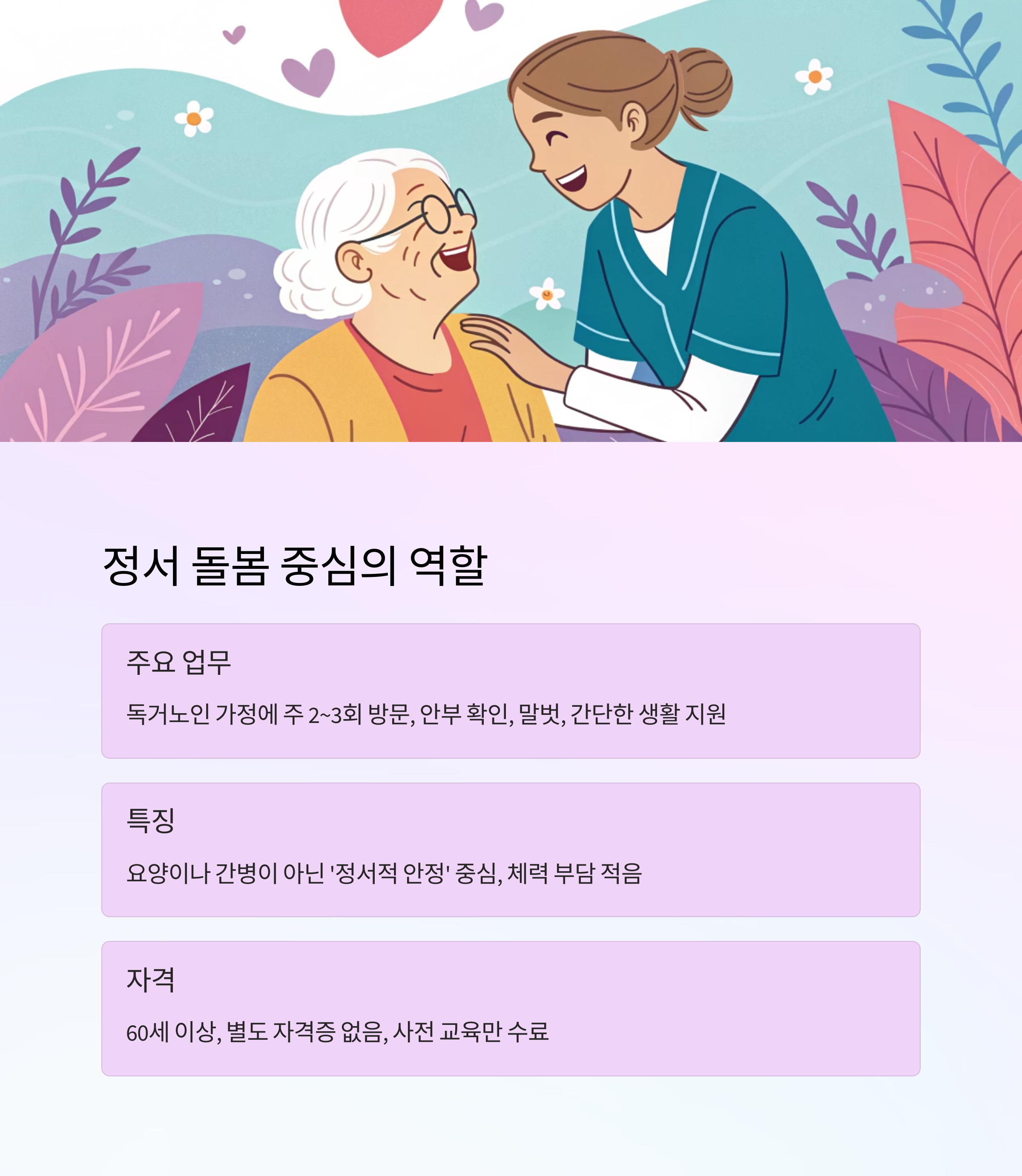 독거노인 가정에 주 2~3회 방문해 안부 확인, 말벗, 간단한 생활 지원을 제공하는 역할입니다.