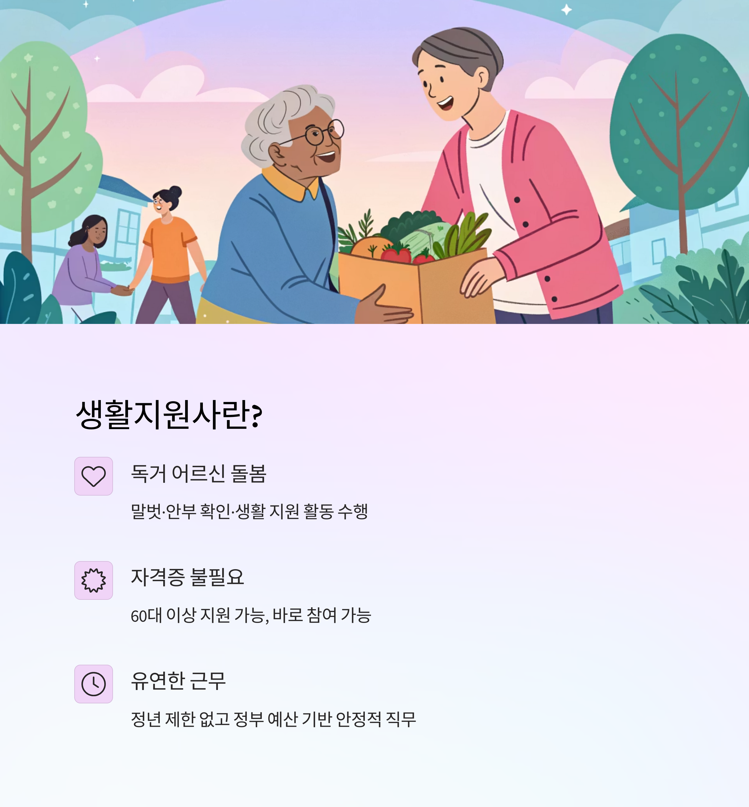60대 이상 고령층이 지원 가능하며, 자격증 없이도 바로 참여할 수 있는 안정적 직무입니다.