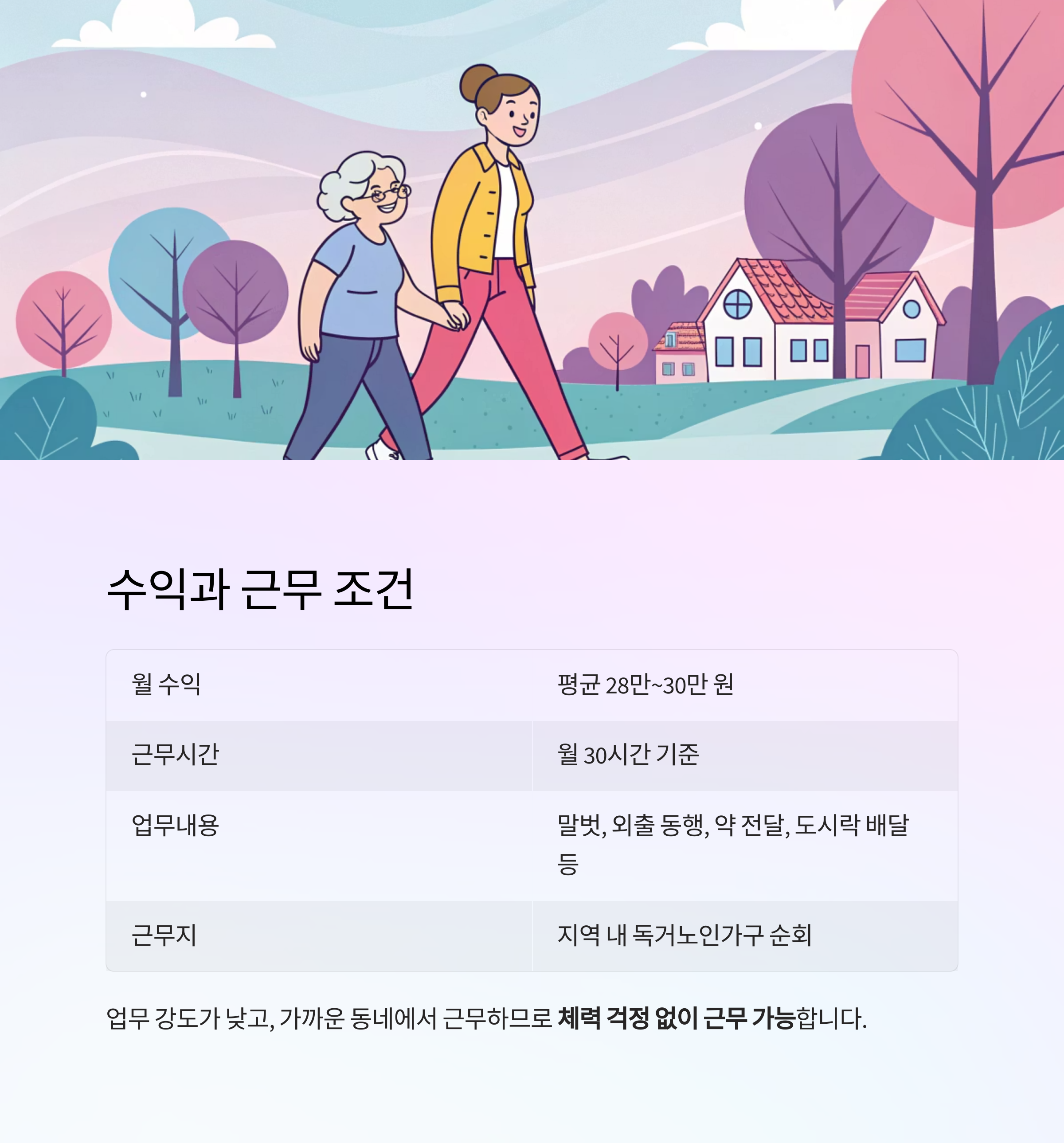 | 업무내용 | 말벗, 외출 동행, 약 전달, 도시락 배달 등 |