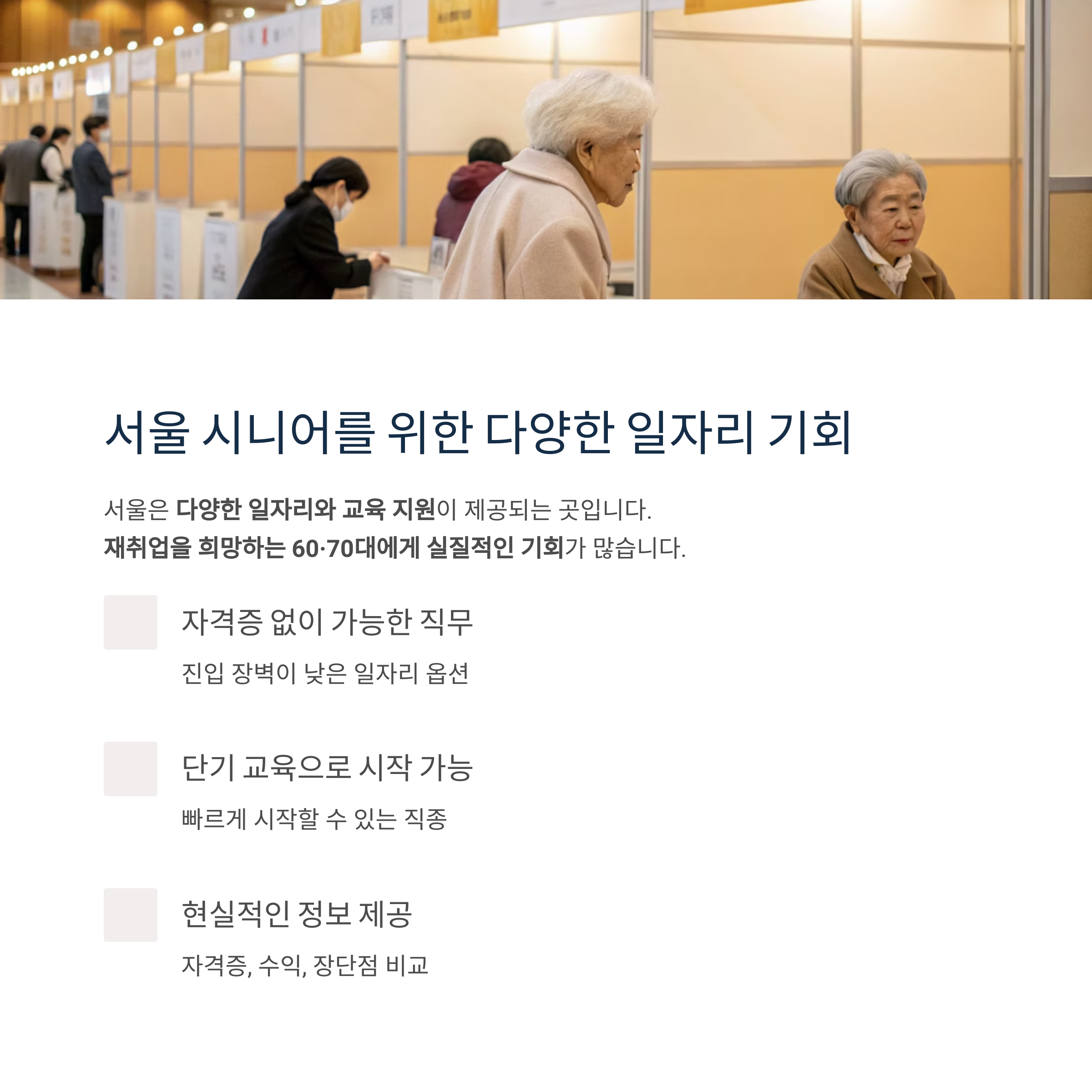 이번 글에서는 2025년 기준 서울 지역에서 실제 가능한 시니어 일자리 3가지를 중심으로