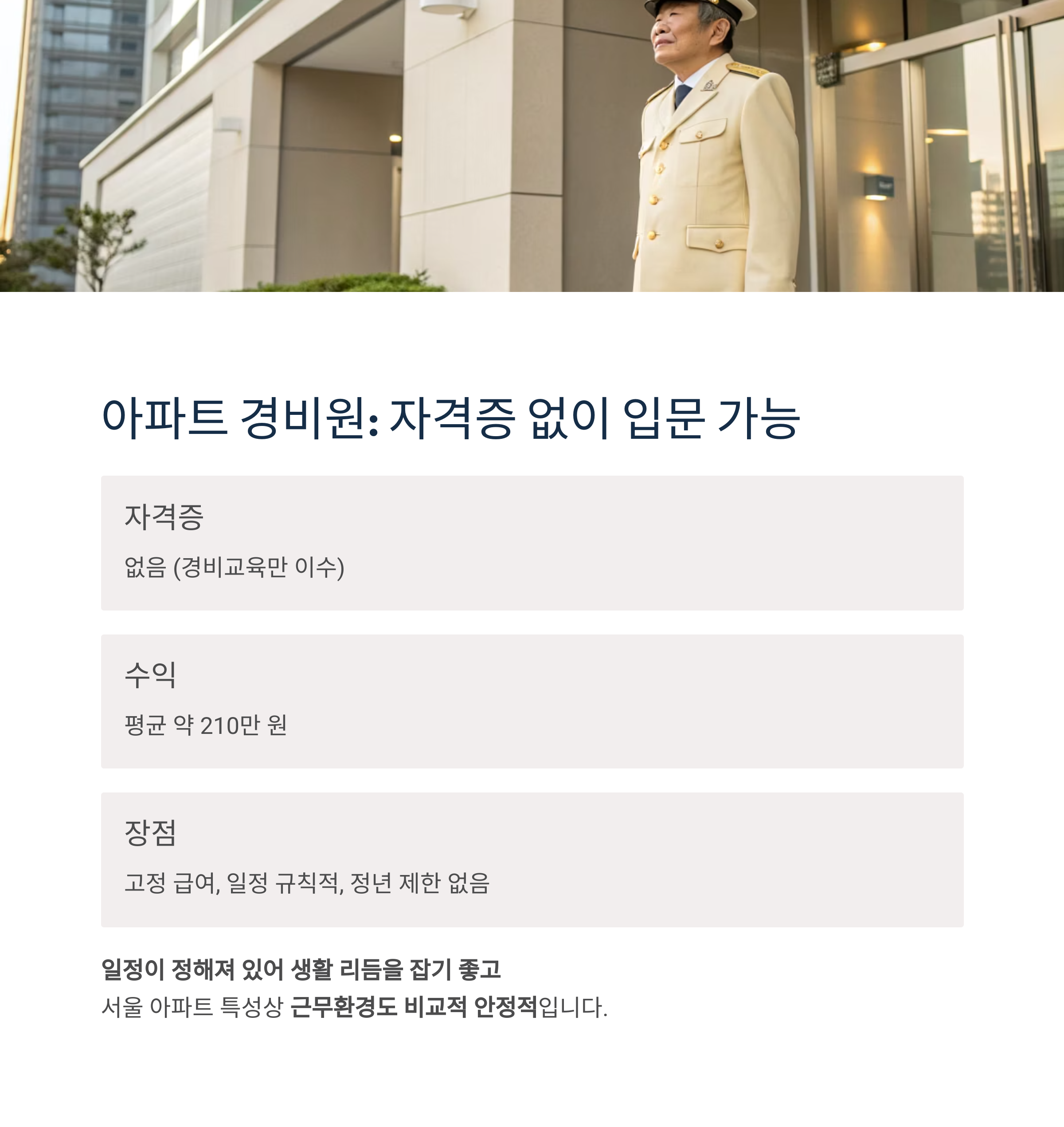 👮 3. 아파트 경비원: 자격증 없이 입문 가능한 서울 시니어 직무
