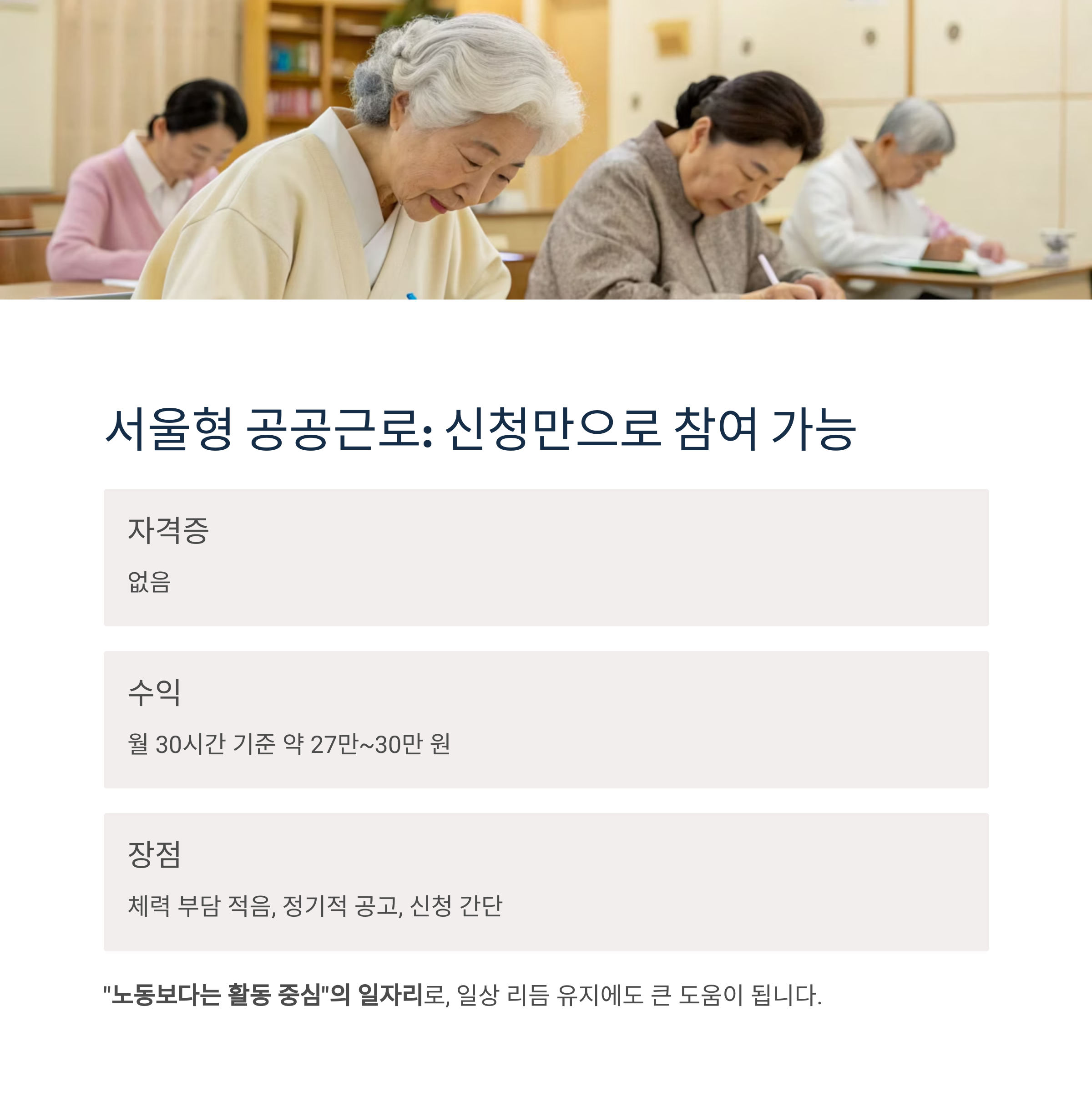 “노동보다는 활동 중심”의 일자리로, 일상 리듬 유지에도 큰 도움이 됩니다.