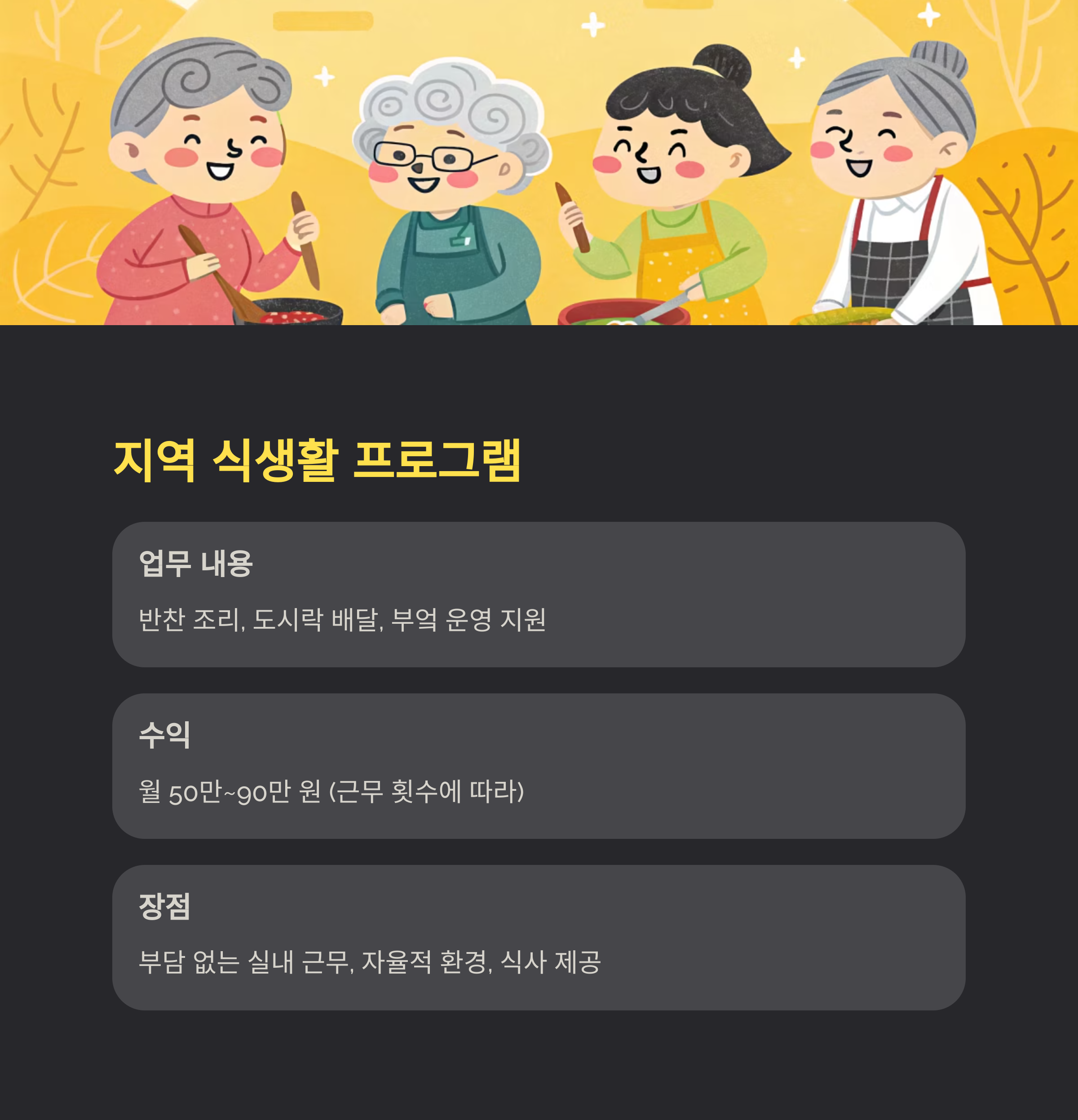 시니어 대상으로 반찬 조리, 도시락 배달, 부엌 운영 지원 인력 등을 채용하고 있습니다.