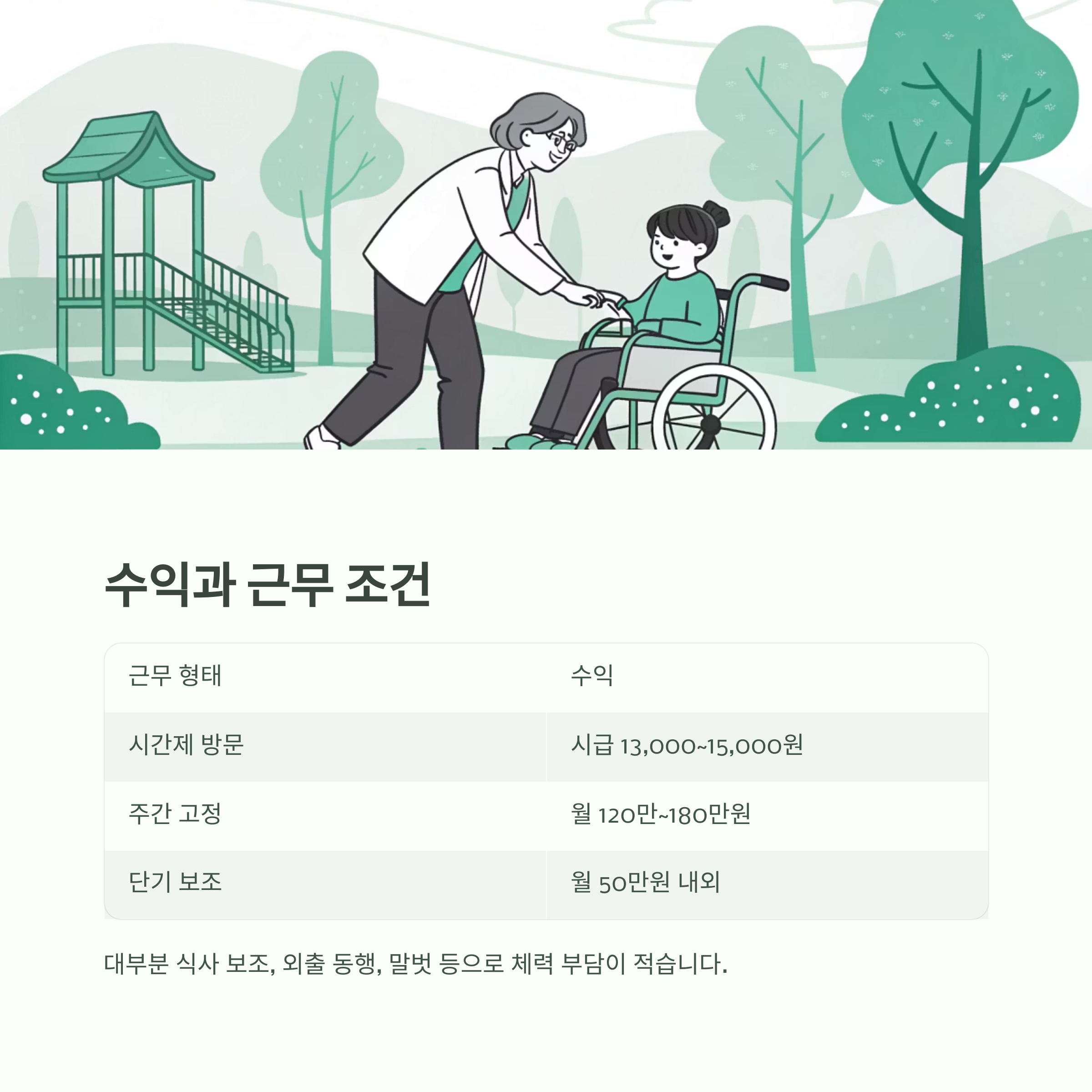 | 단기 보조 지원 | 주 2~3회, 월 50만 원 내외 | 체력 부담 거의 없음 |