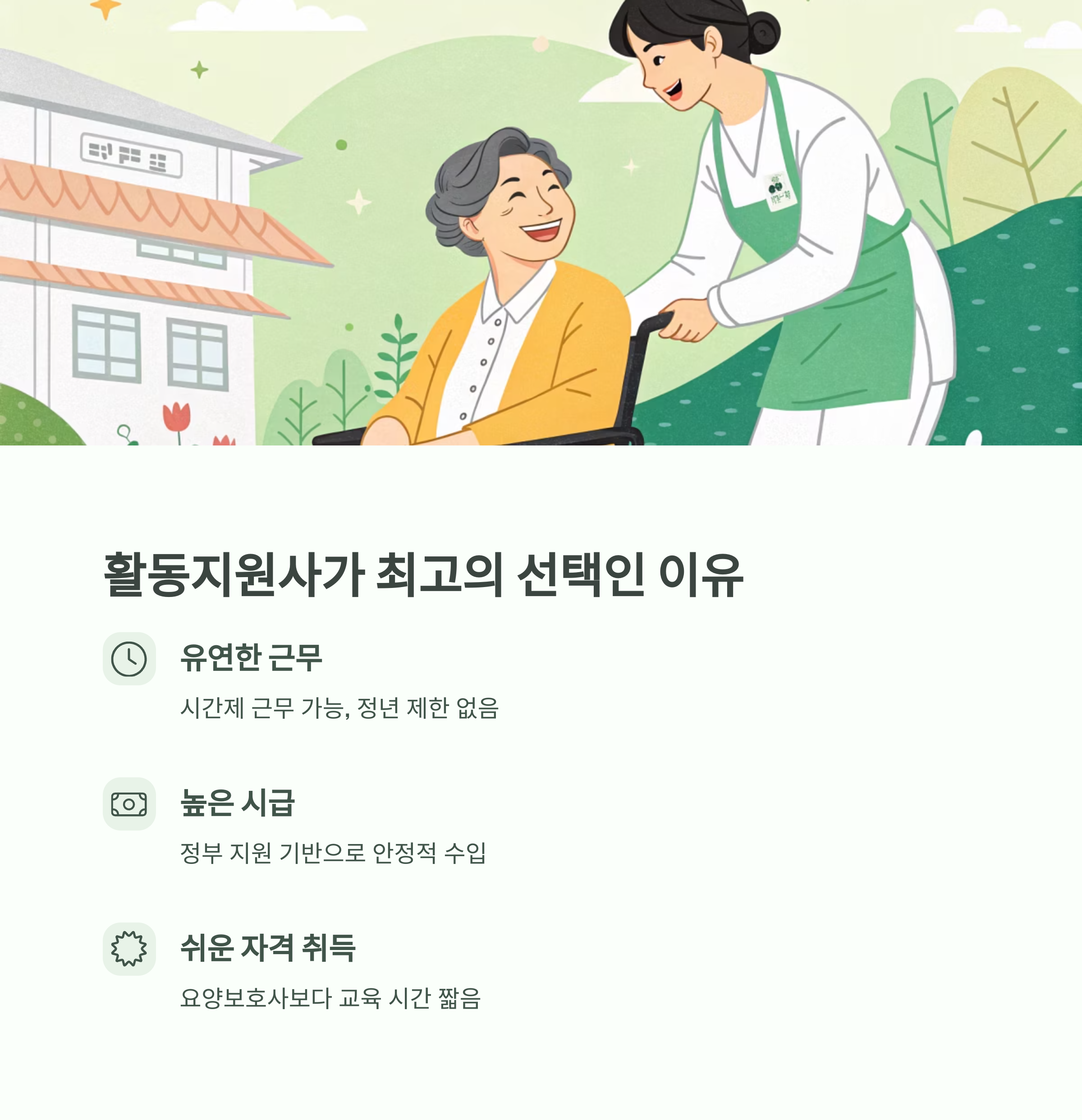 활동지원사는 적은 교육 시간, 낮은 체력 부담, 높은 시급, 정년 없음이라는 네 가지 장점으로