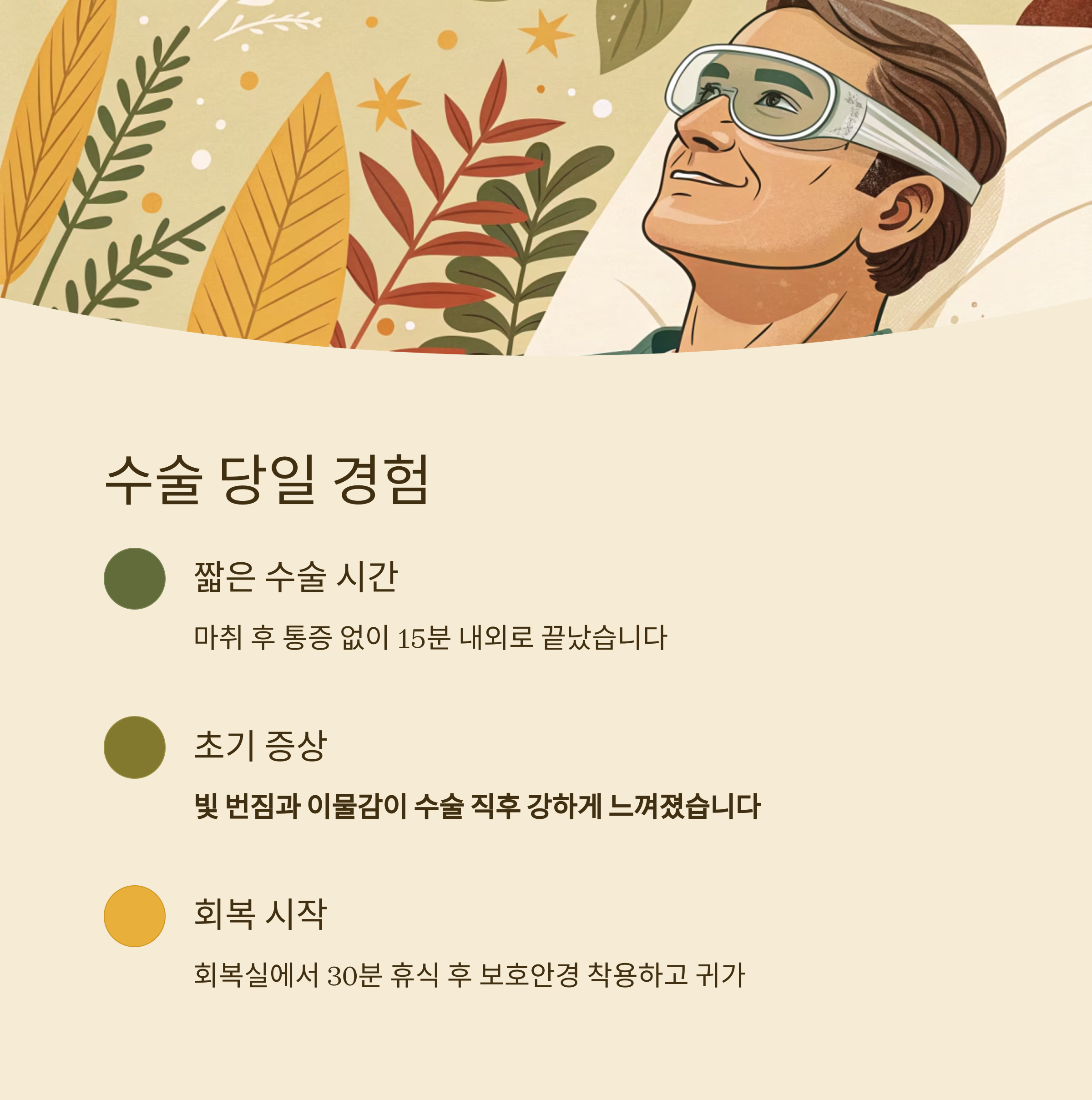 수술 다음날은 눈물이 자주 나고 강한 빛 번짐이 가장 힘든 시기였습니다