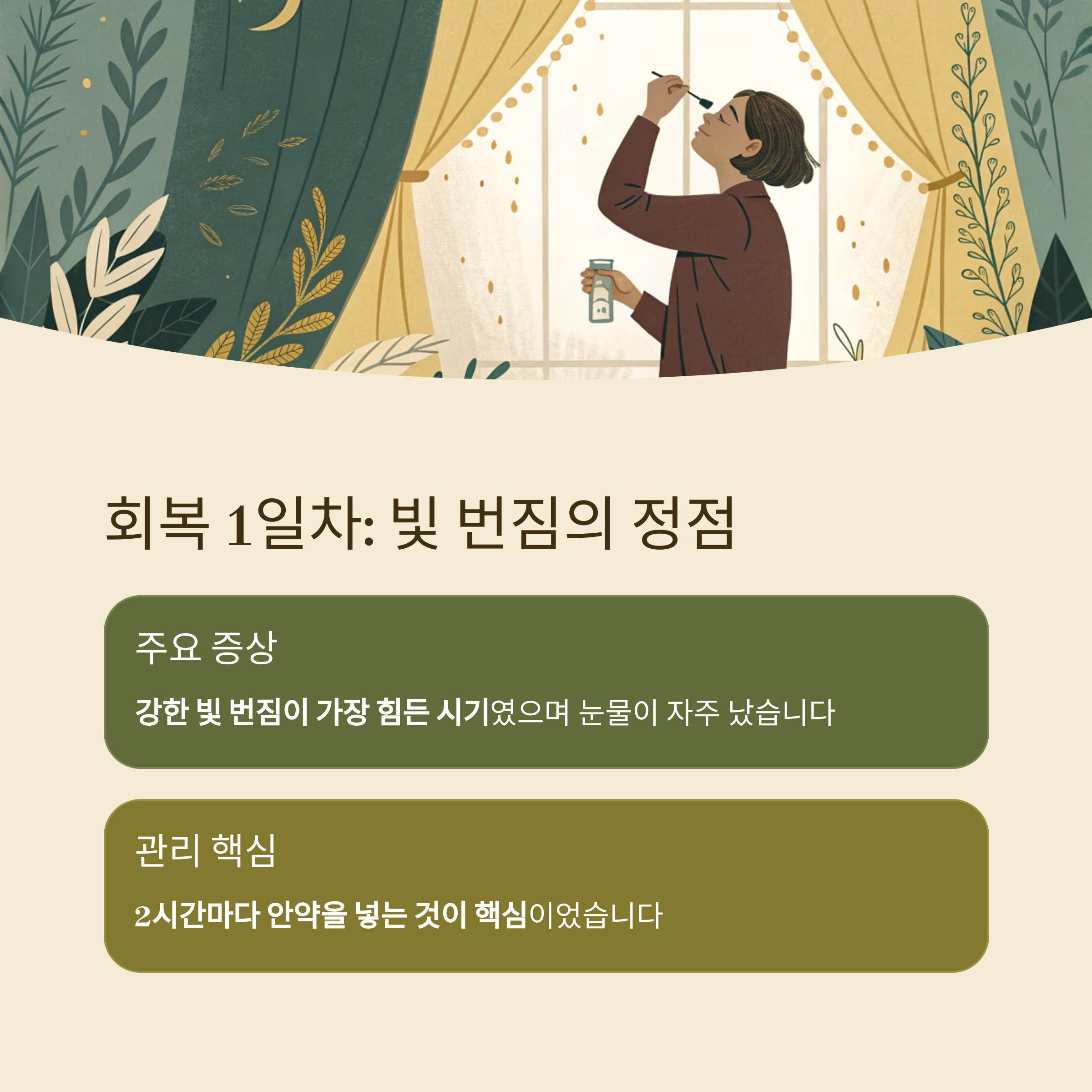 수술 다음날은 눈물이 자주 나고 강한 빛 번짐이 가장 힘든 시기였습니다