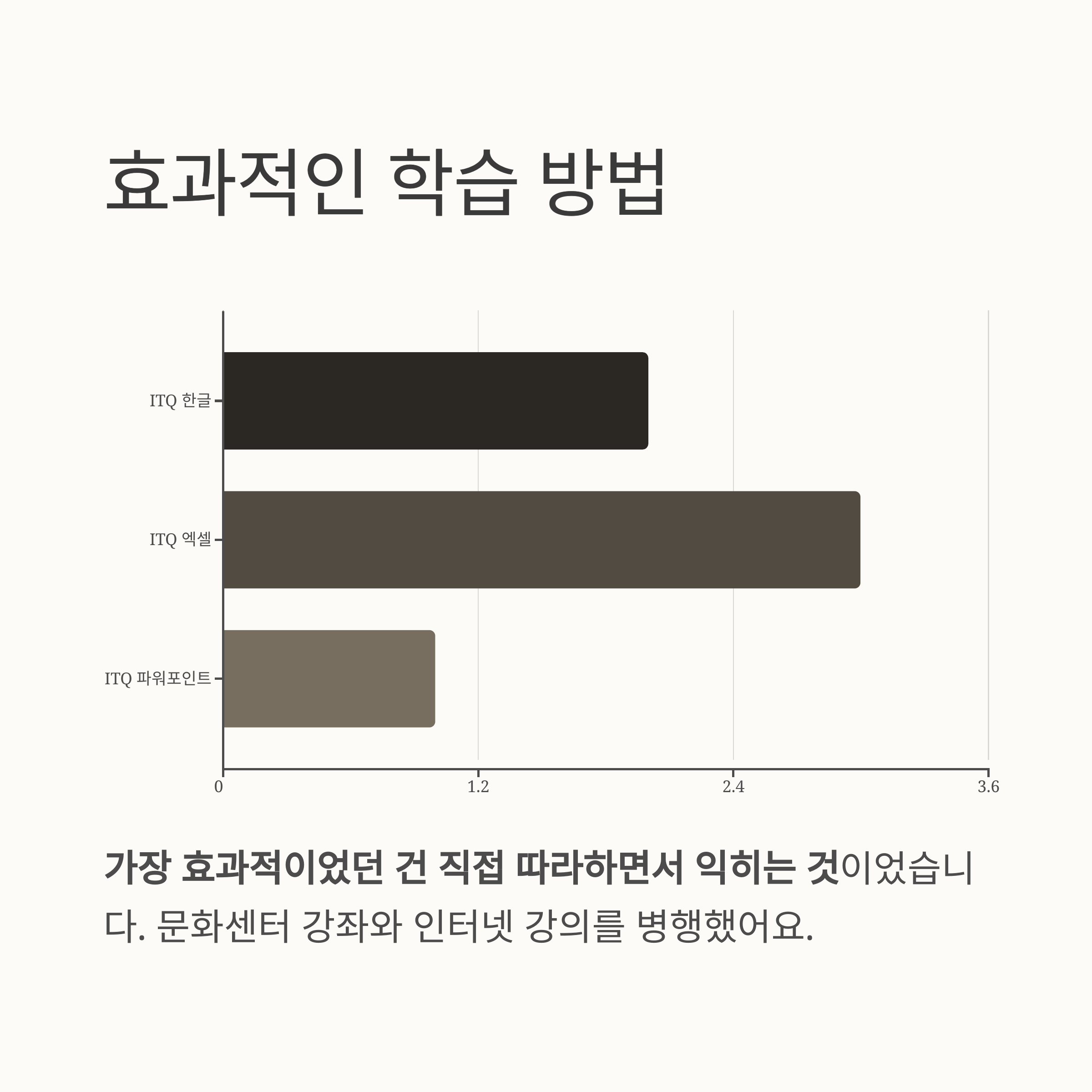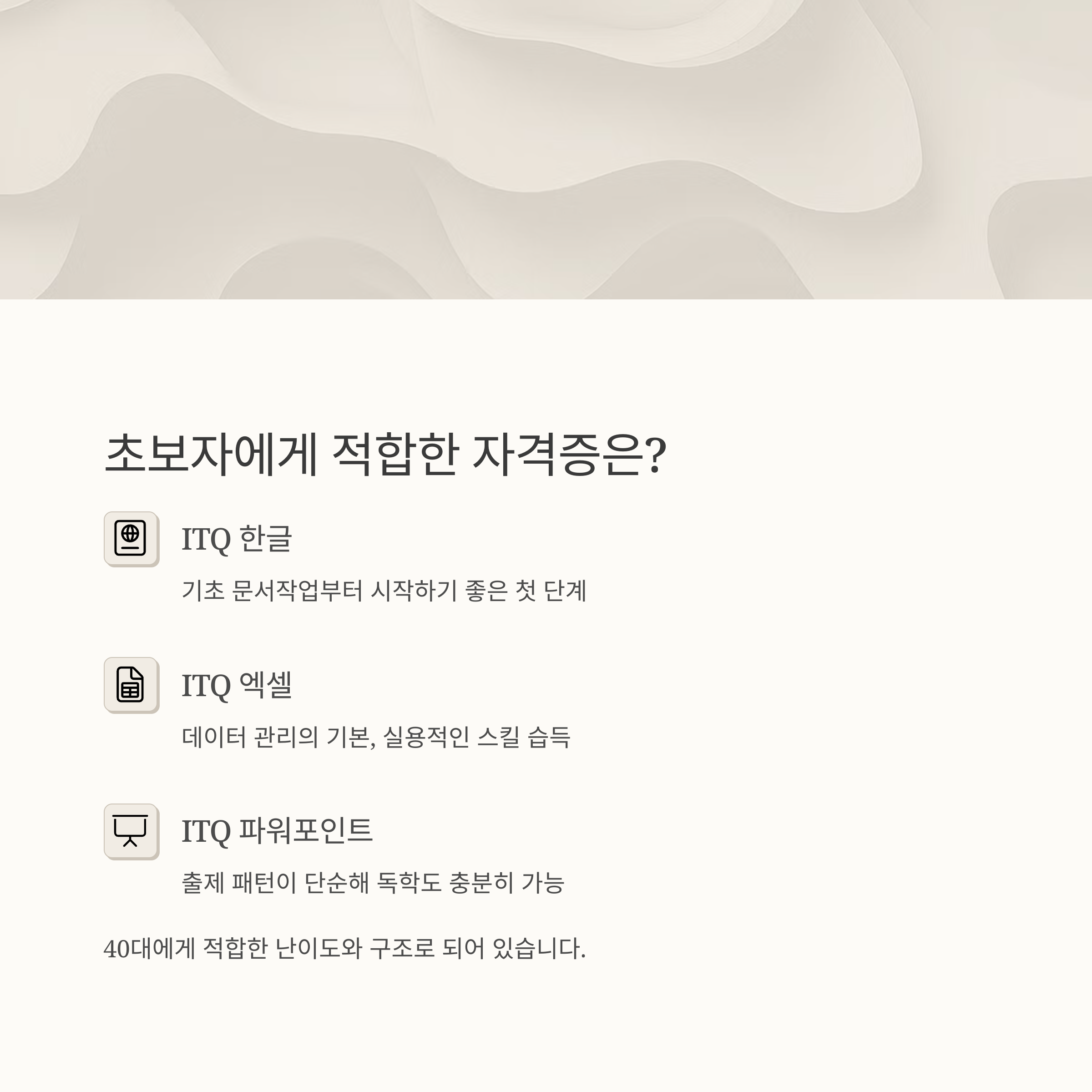→ ITQ 시리즈가 입문자에게 가장 현실적이고 취업에도 도움이 됩니다.